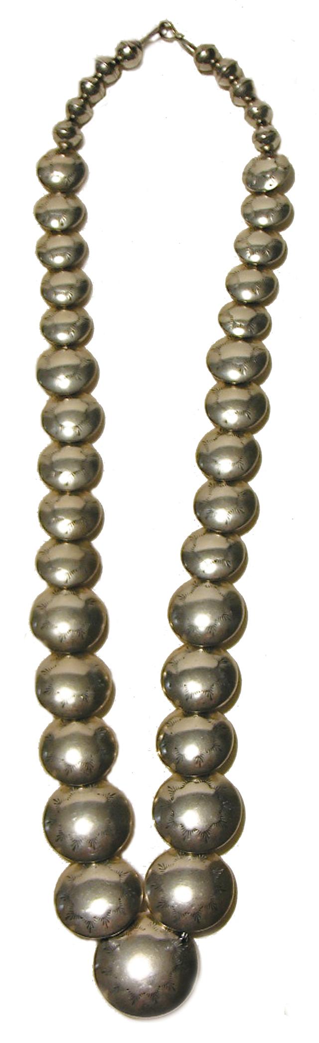 Late 1900s, Beautiful hand wrought silver necklace of graduated circular stamped discs. 24"
