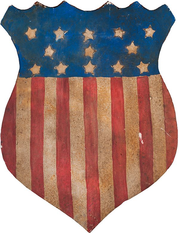 Hand-Carved 13 Star American Shield. 24 x 31 in., made from thick, heavy wood, probably pine, displaying a curvature. Hand-painted gesso coating. Stars are hand-carved on a blue background in the upper third, with red and white stripes on the lower portion. Unmarked as to carver or origin. Probably made for the 1876 Centennial. Ex Claude Harkins Collection.