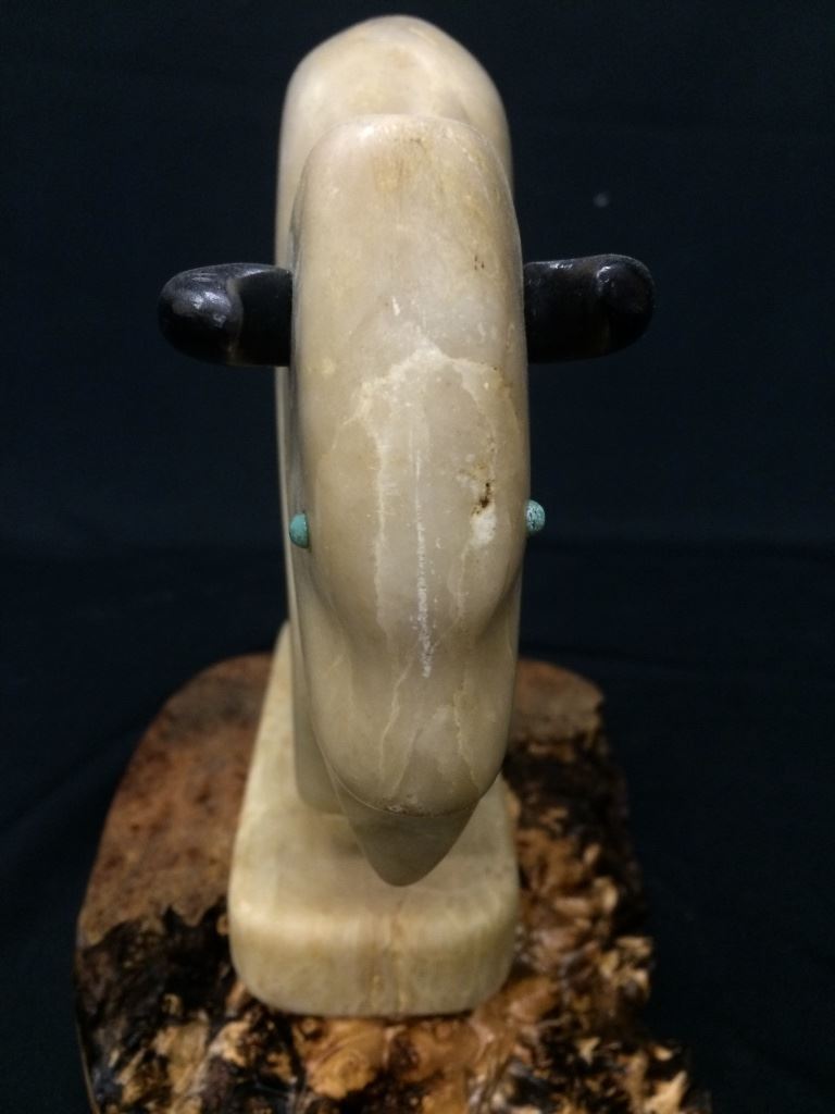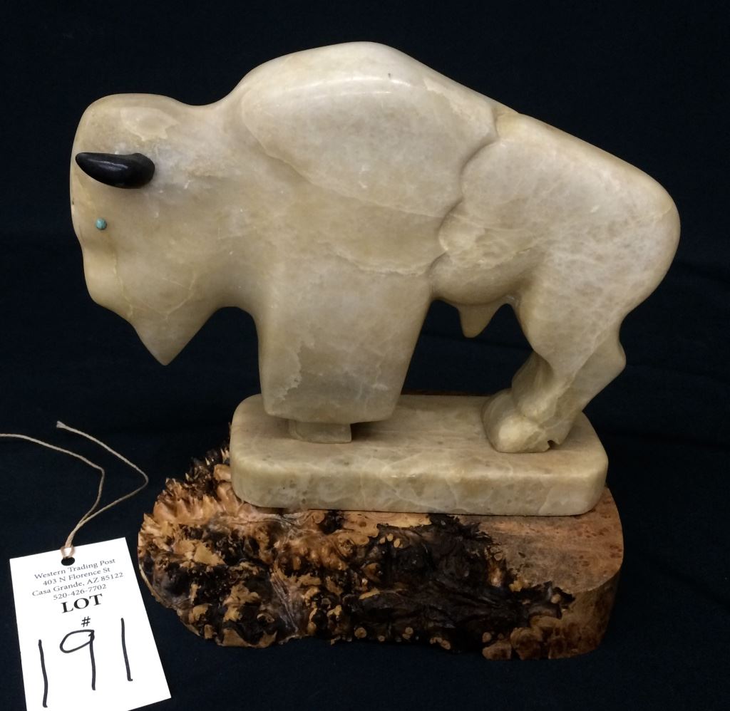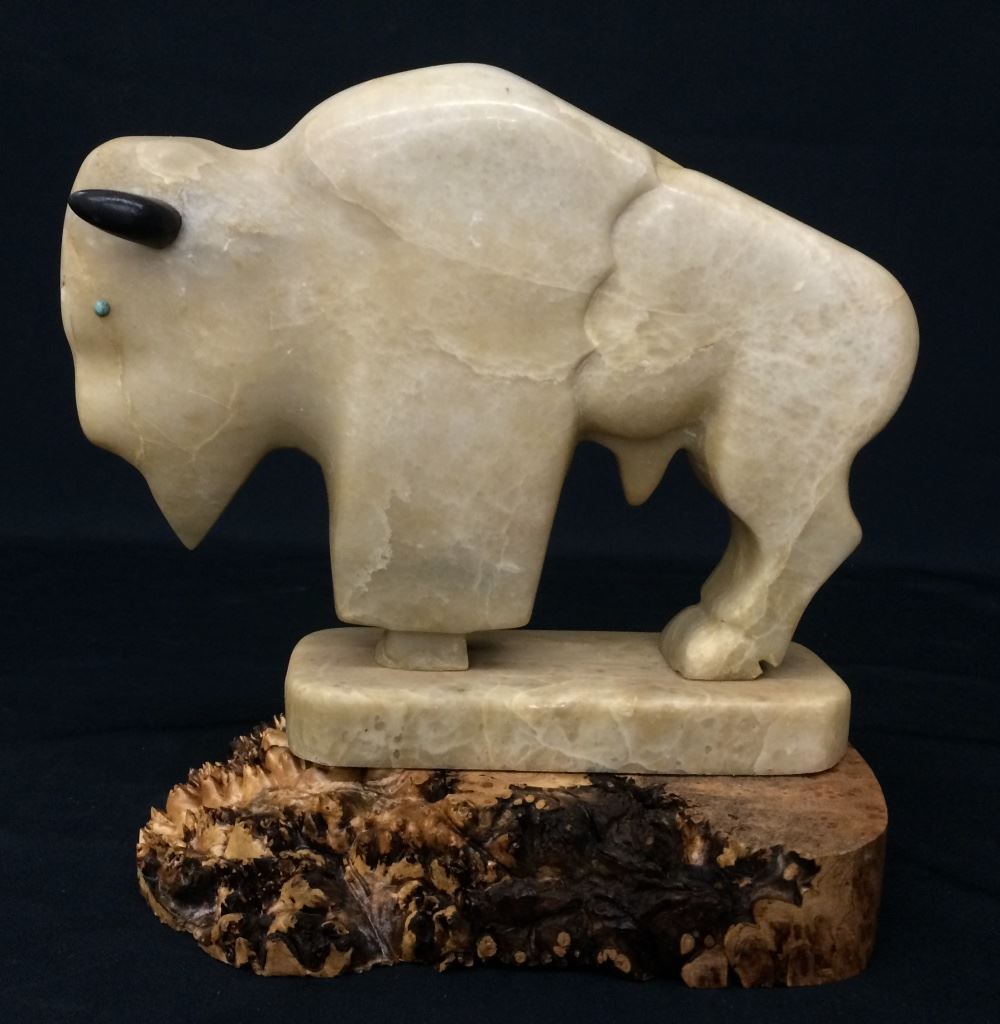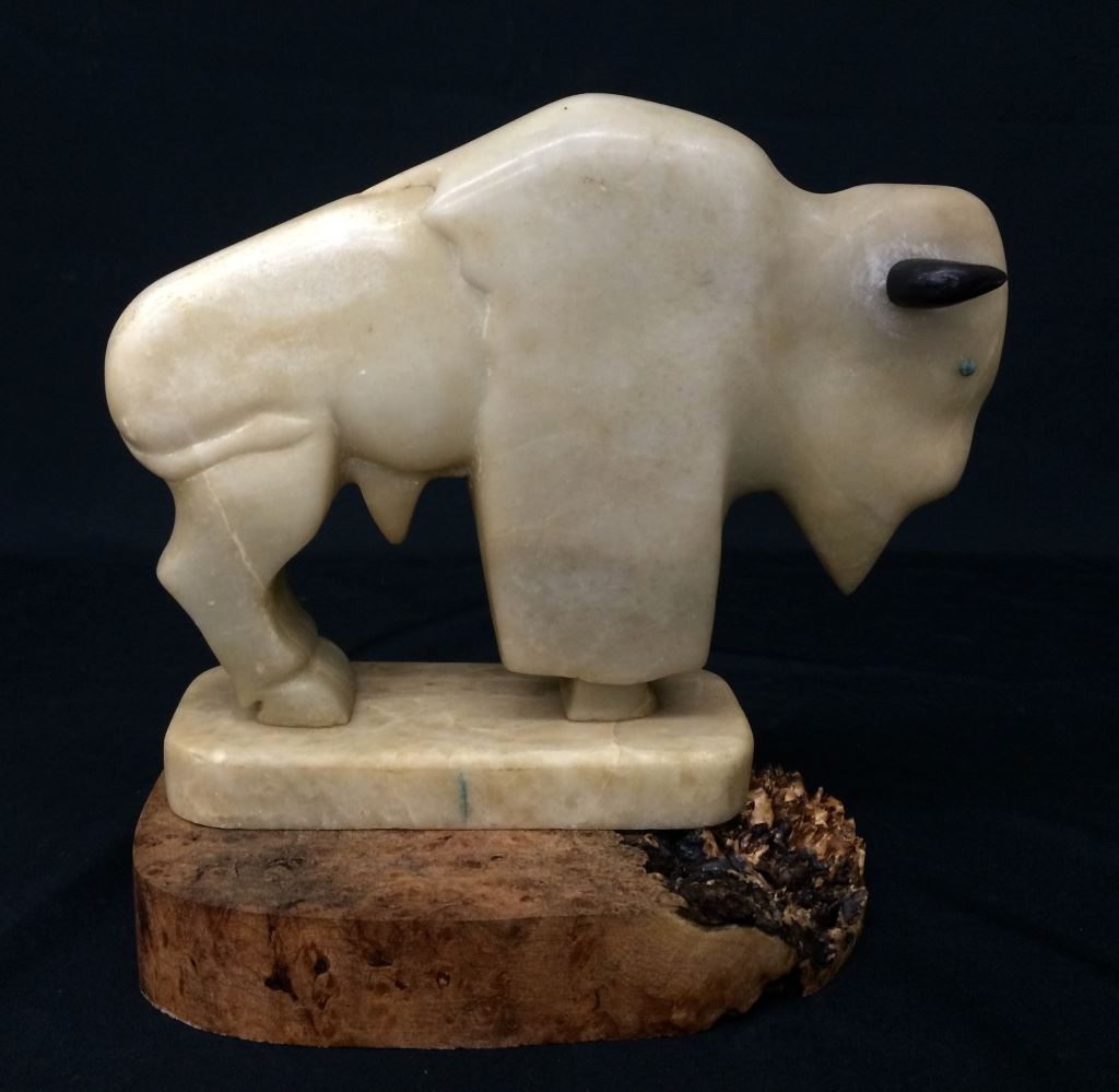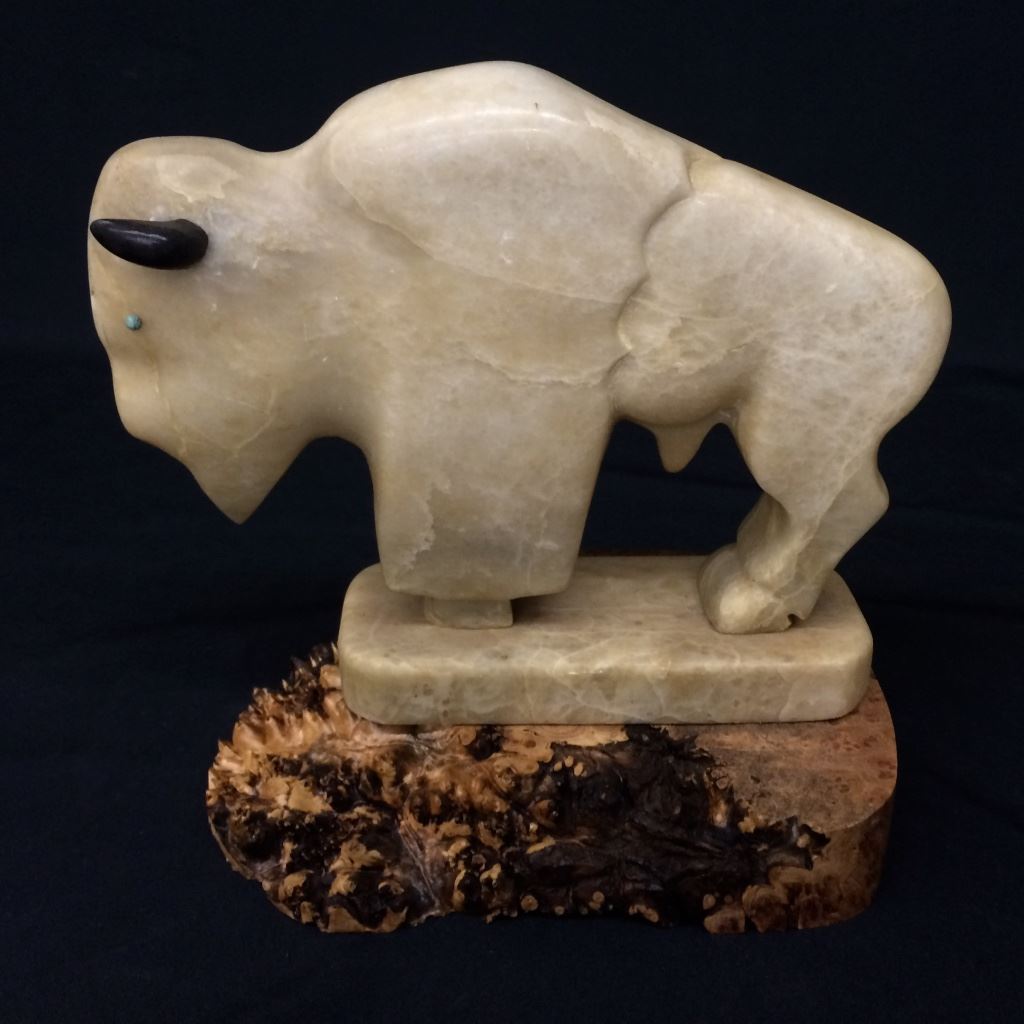 This hand carved vintage Buffalo statue is carved from alabaster and measures 9” tall and 10” long. Mounted on a wood base. Good vintage condition. Shipping: There will be a $7 handling / packaging fee for shipping this lot. The actual cost of postage will be added on top of that.