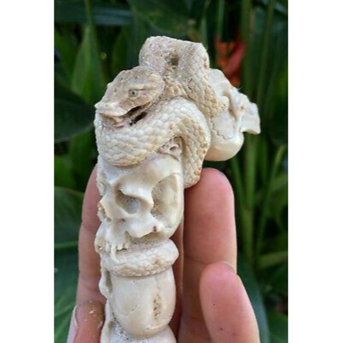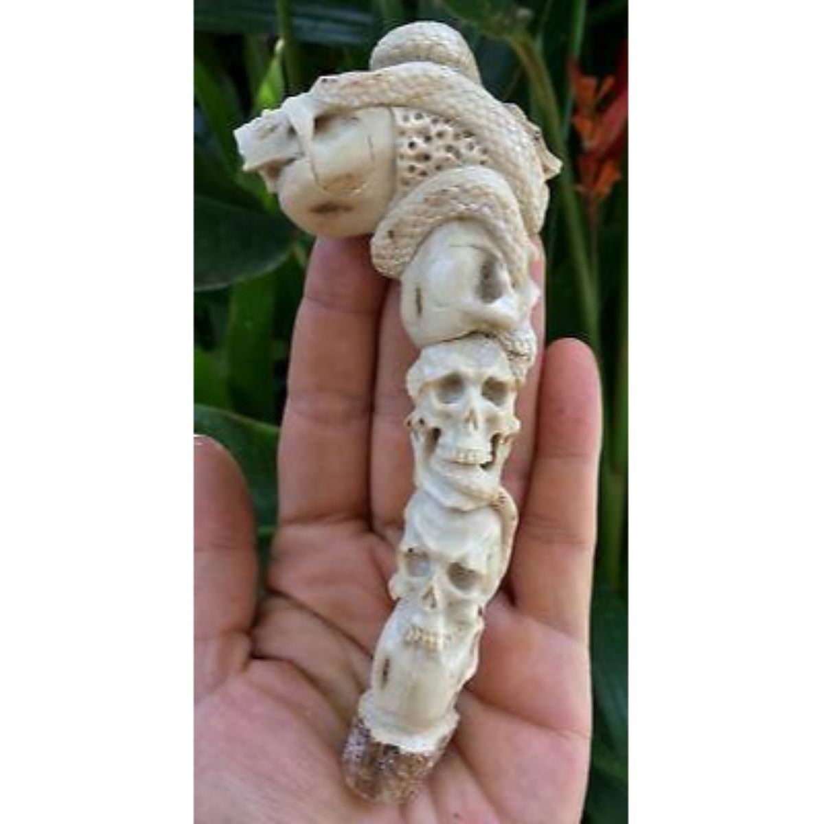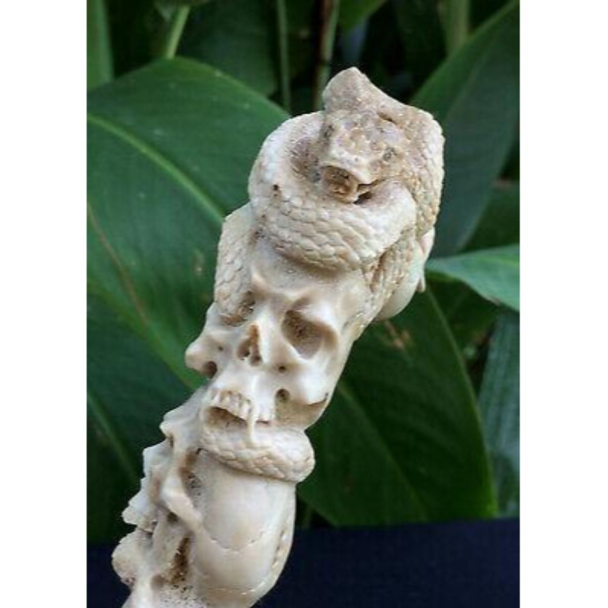 Fantastic one of a kind hand-carved shed deer antler skeleton skulls & cobra snake cane handle, knife handle for display. 5 3/4" L X 2 1/2" W X 1" thick.