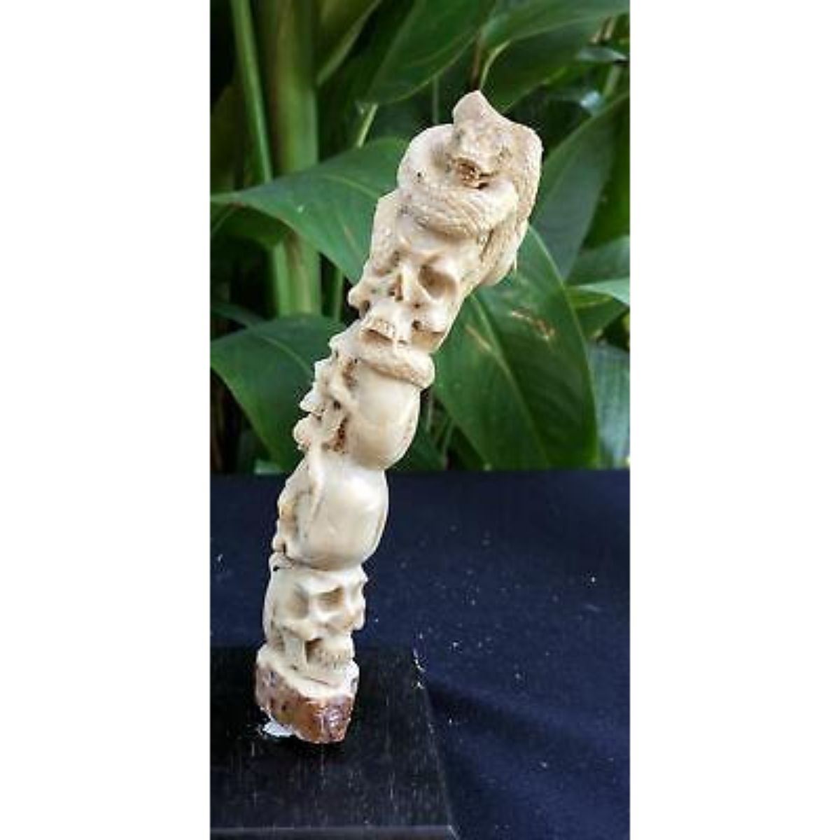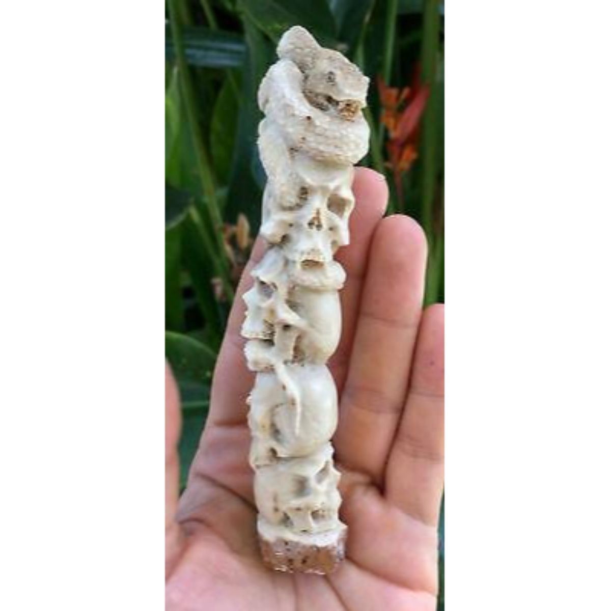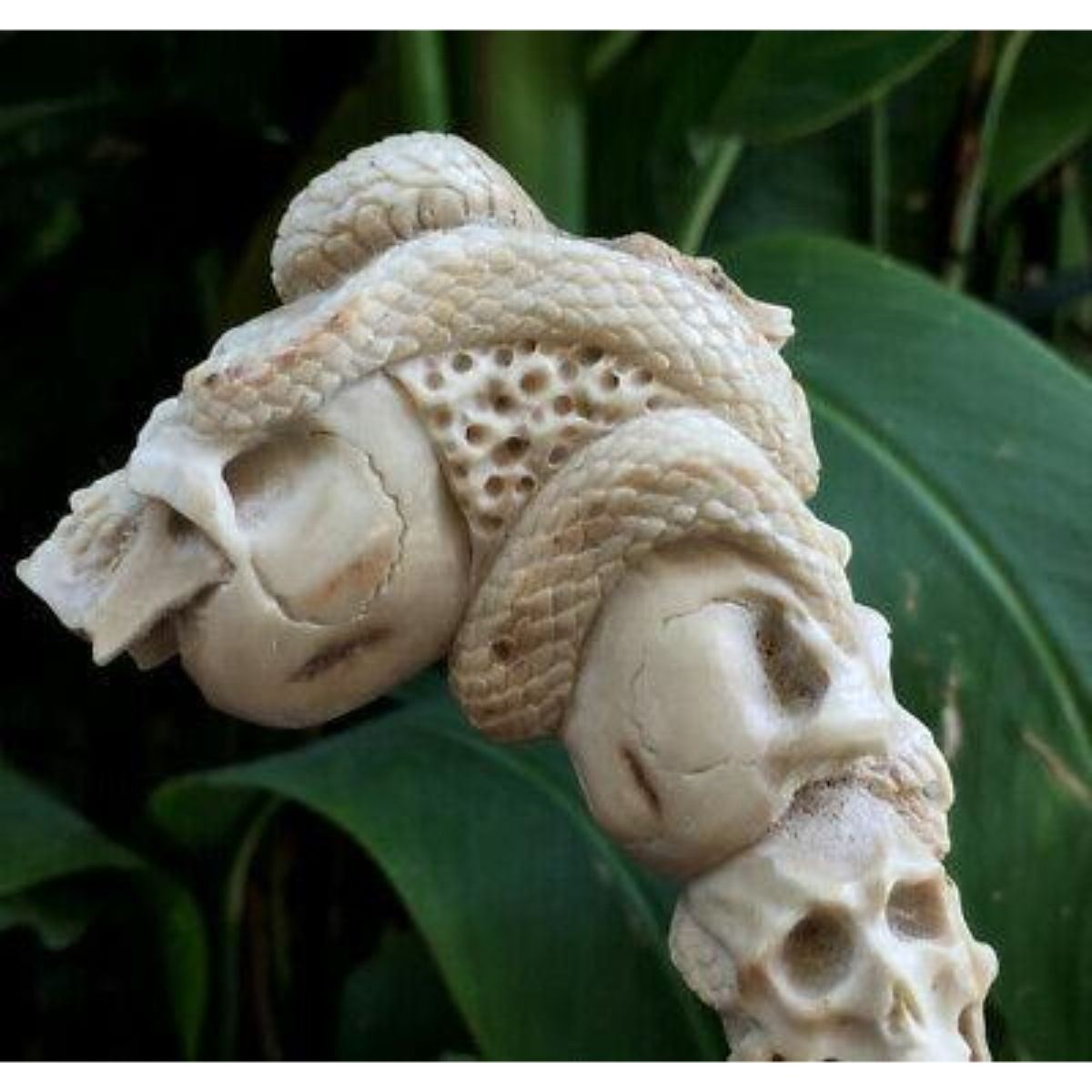 Fantastic one of a kind hand-carved shed deer antler skeleton skulls & cobra snake cane handle, knife handle for display. 5 3/4" L X 2 1/2" W X 1" thick.