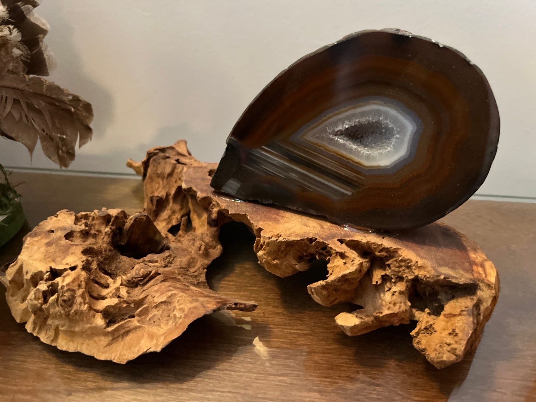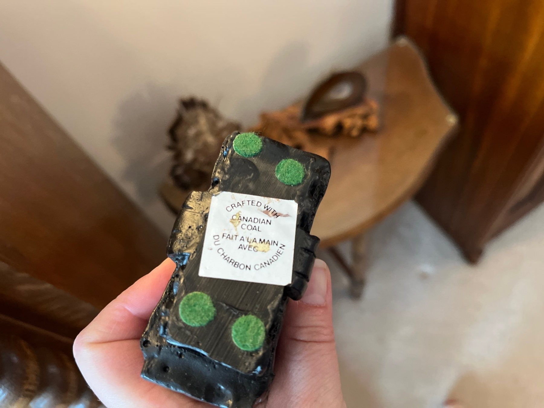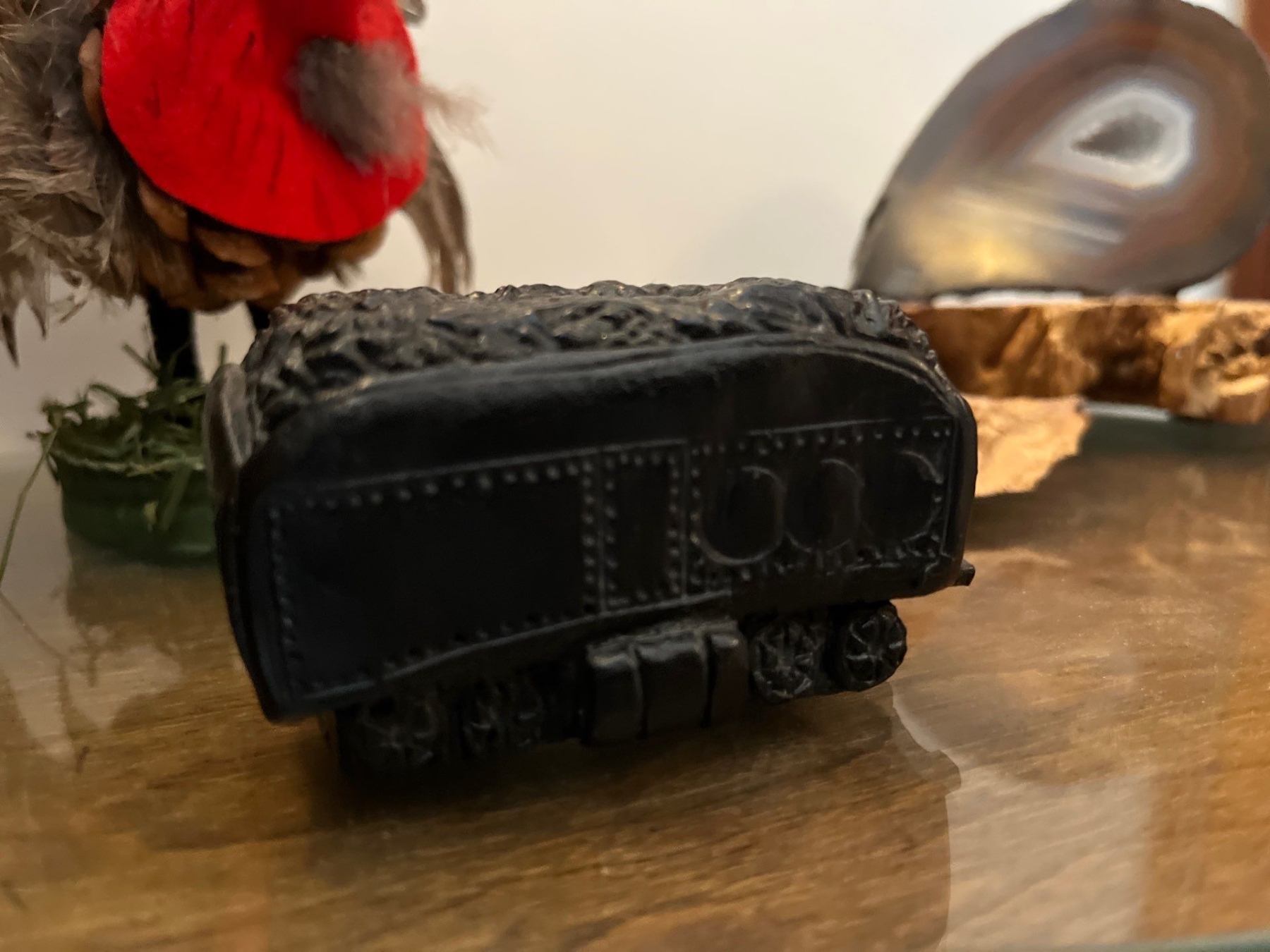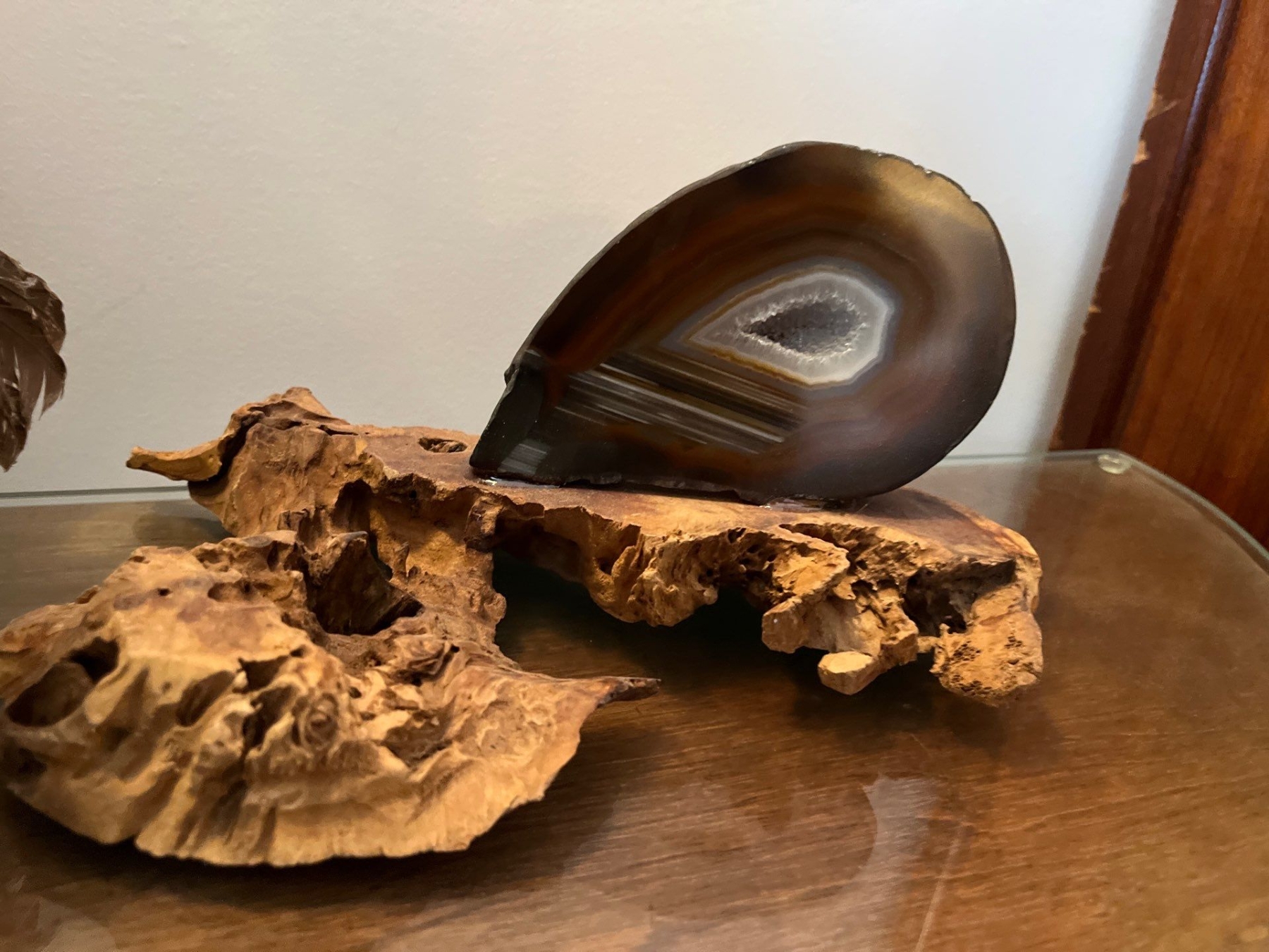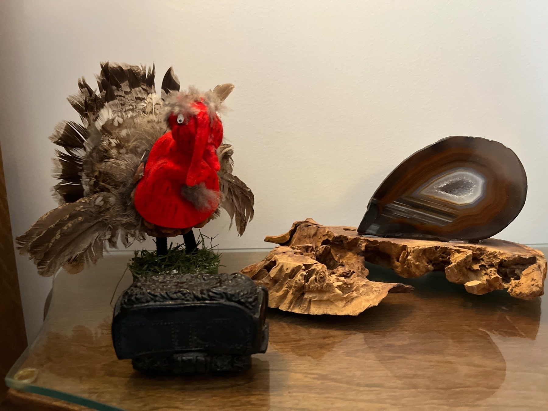 Hand carved Canadian coal with rock sculpture, and folk art bird sculpture