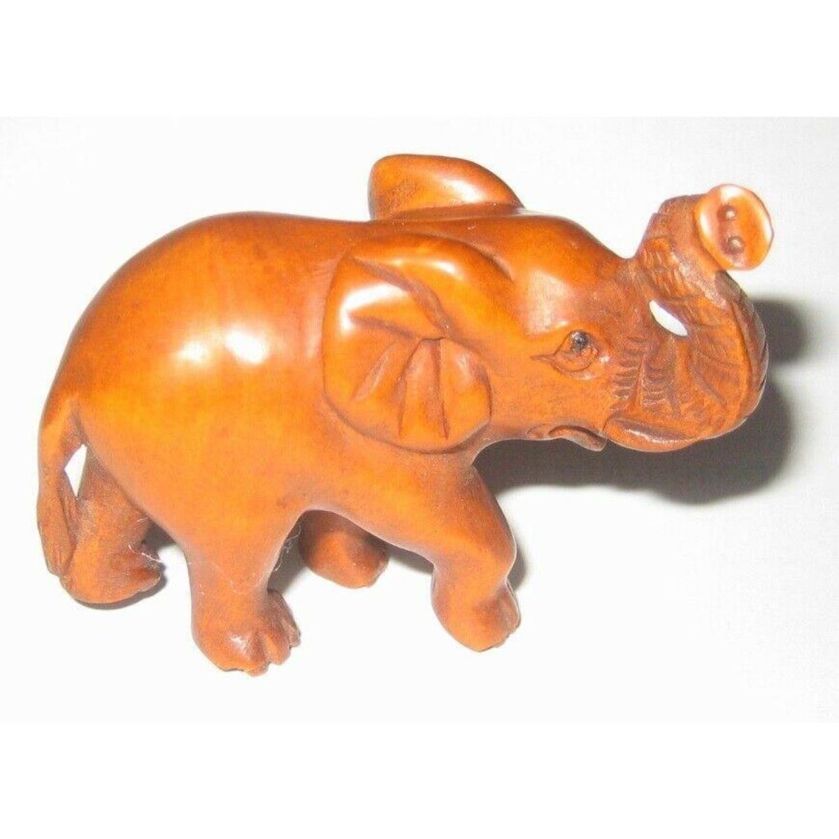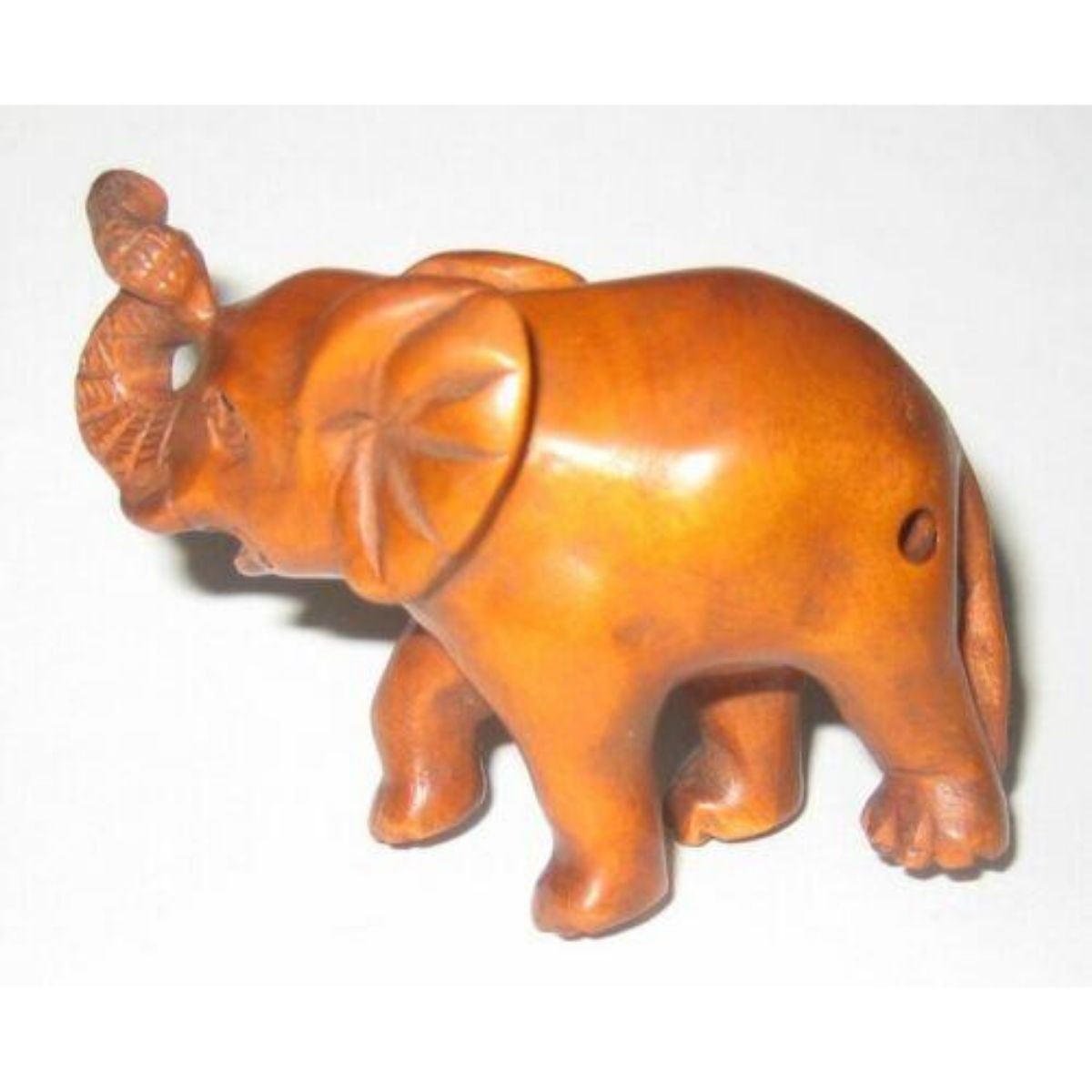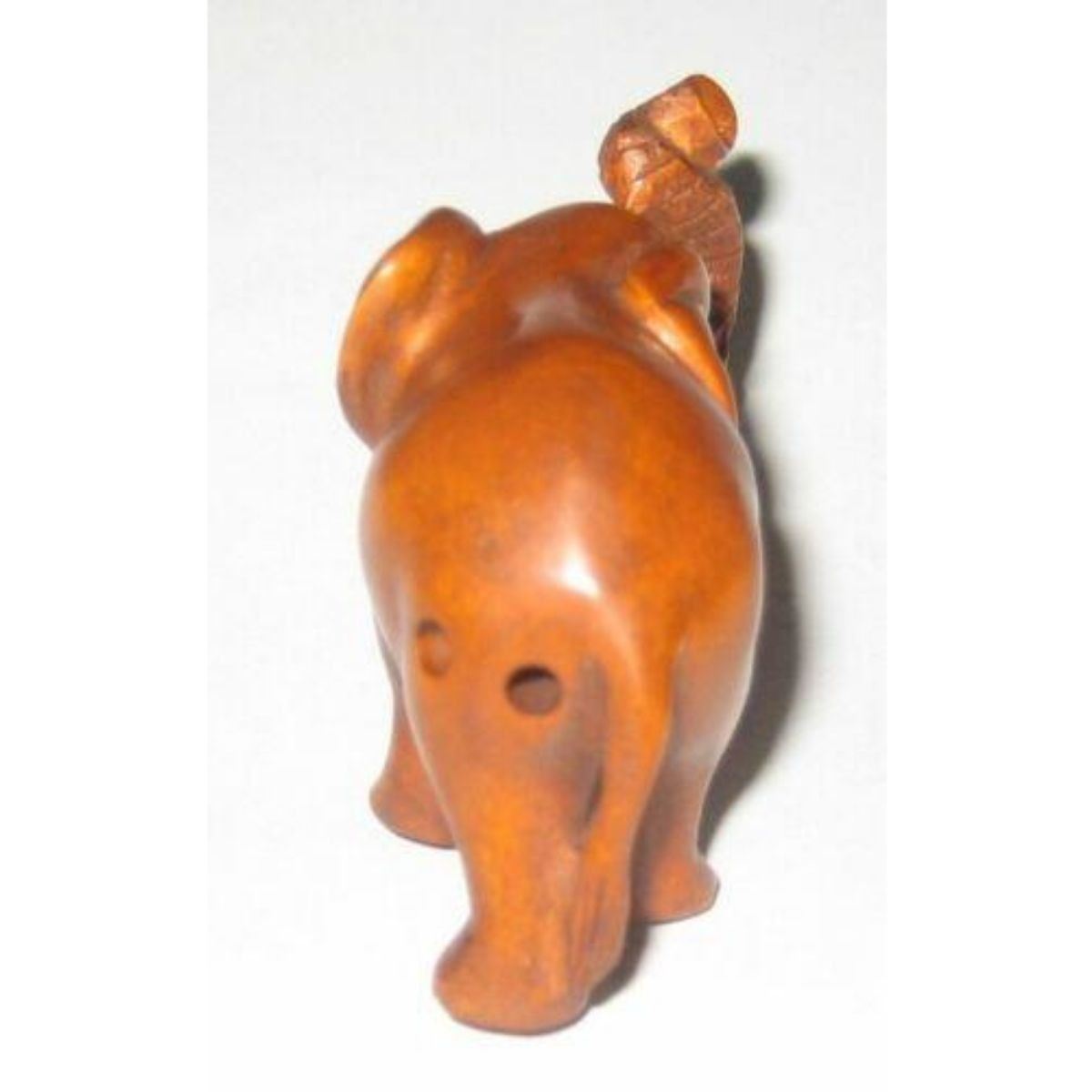 Hand-carved boxwood netsuke, in the form of a walking elephant with inlaid eyes. Signed by the artist. 60x45x23mm.Â