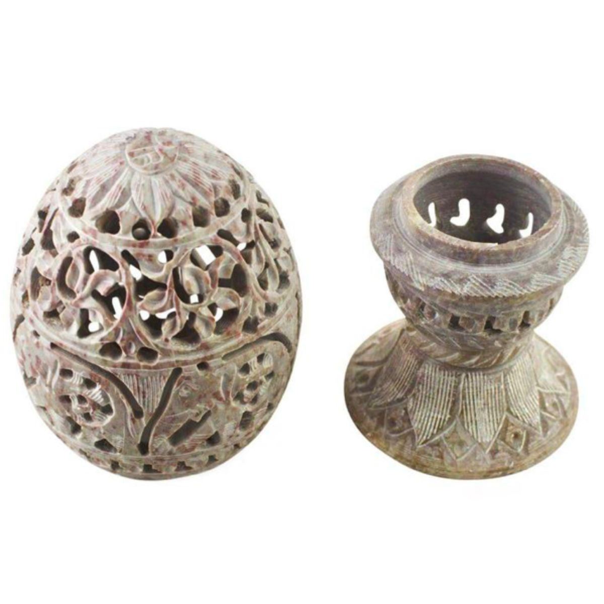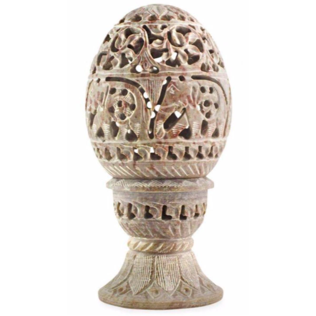 Hand-carved pierced egg, decorated with elephants around the circumference on a carved stone stand. 6 1/2" H X 3" D overall. Egg dimensions: 3 3/4" H x 3" D. Stand dimensions: 2 3/4" H X 2 1/2" D.