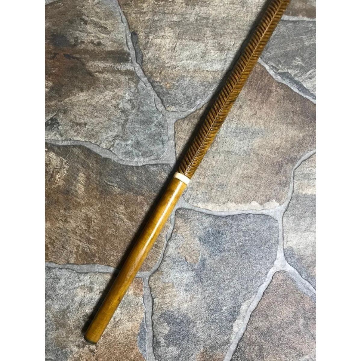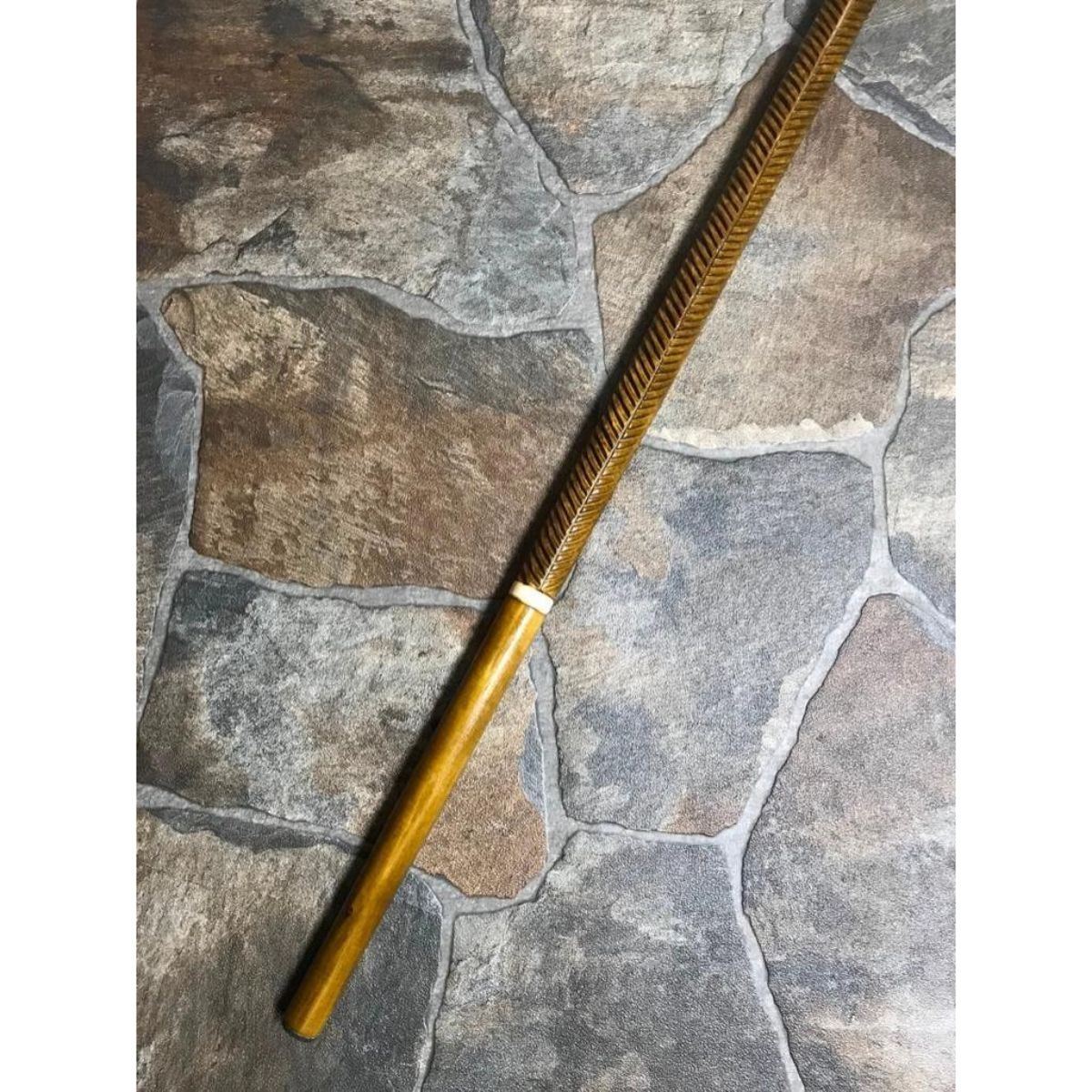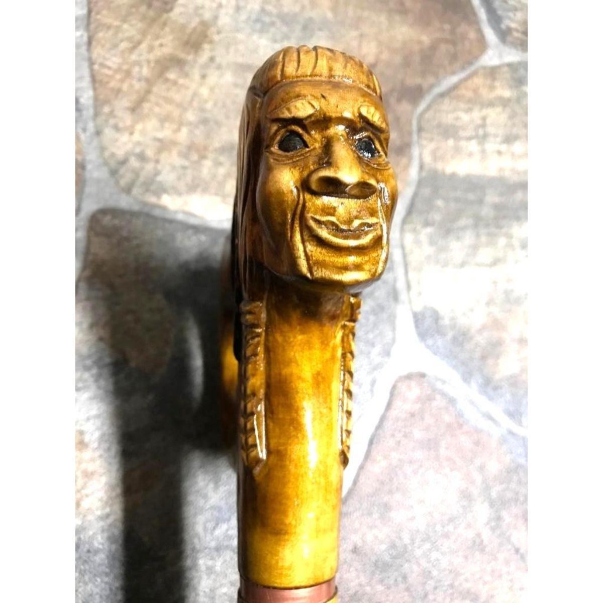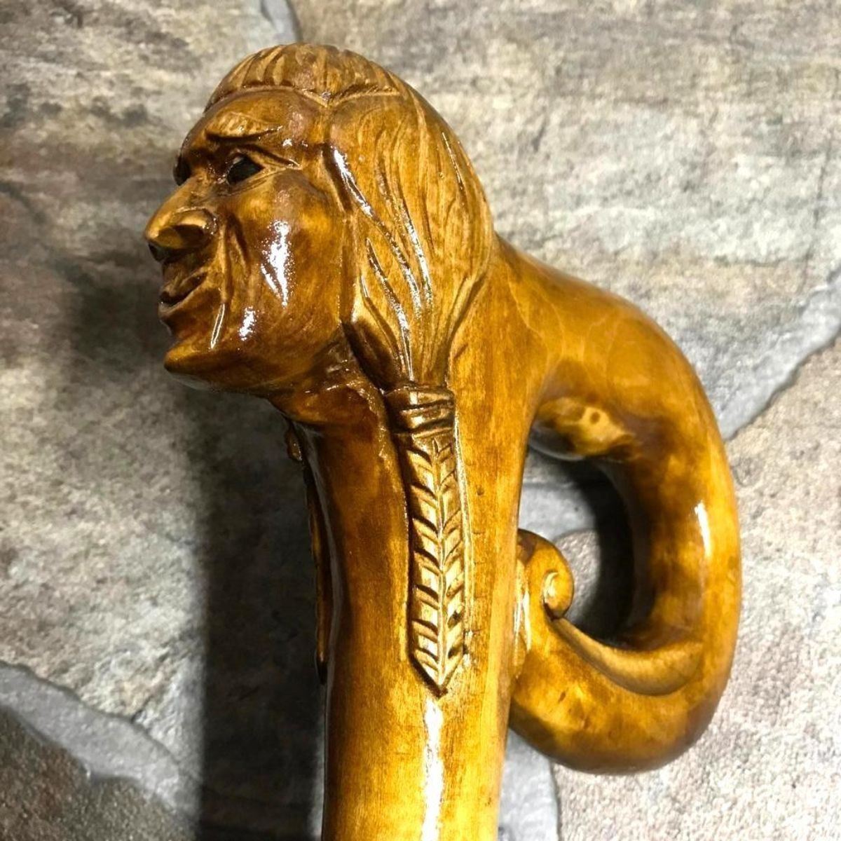 Hand-carved cane, walking stick, depicting a Native American Indian head carved into the handle. Made by Ukrainian artisan from Linden tree wood. 36" H X 6 3/4" W.Â