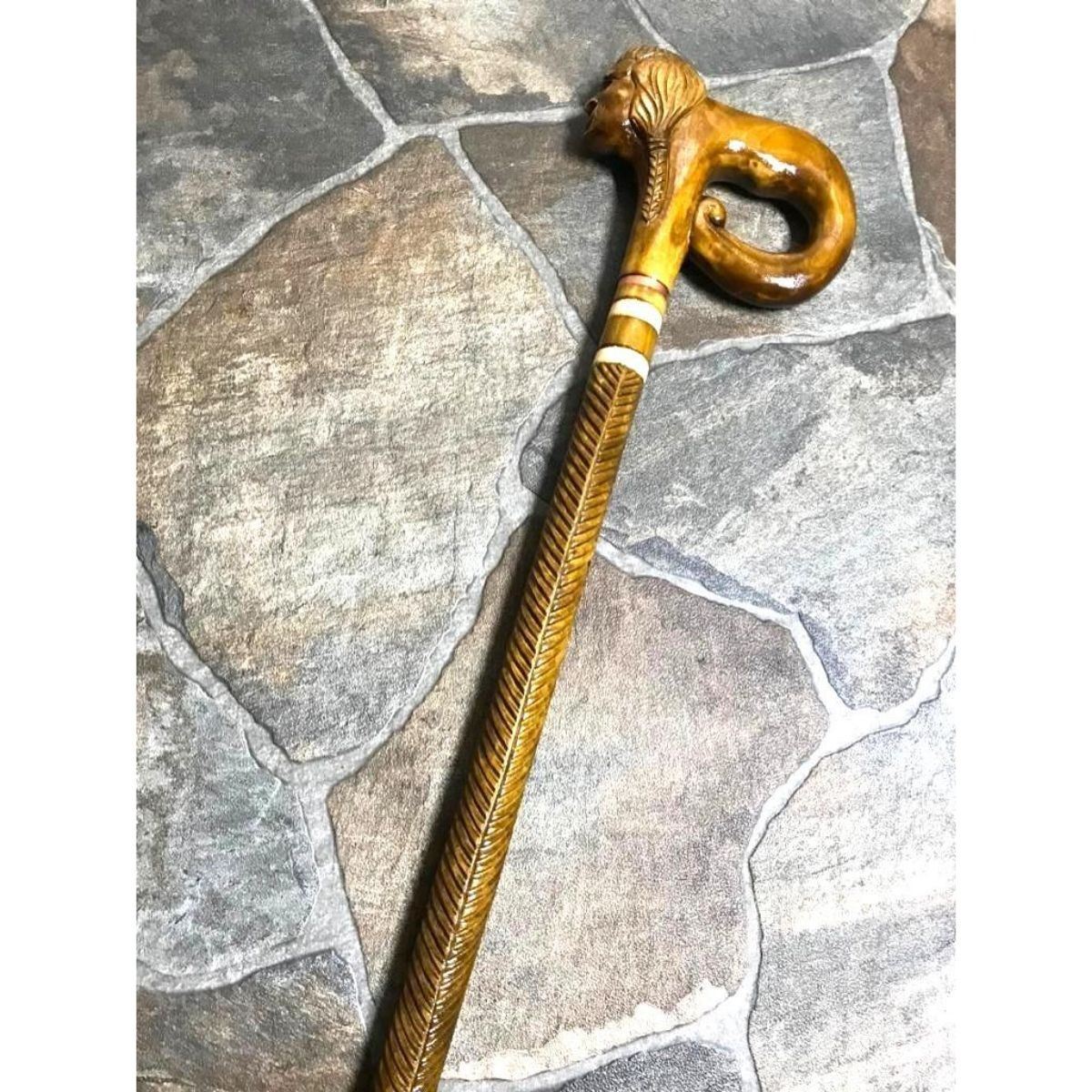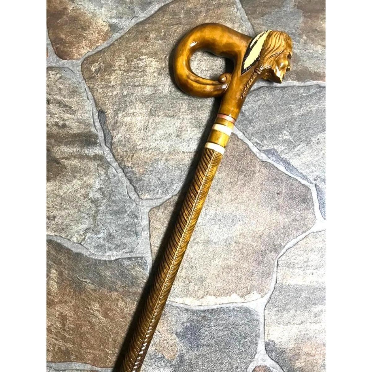 Hand-carved cane, walking stick, depicting a Native American Indian head carved into the handle. Made by Ukrainian artisan from Linden tree wood. 36" H X 6 3/4" W.Â