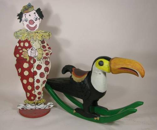 Hand carved wooden Toucan figural child's rocker, 39 inches lond and an upright wooden clown figure, 31 inches tall. Good Cond.