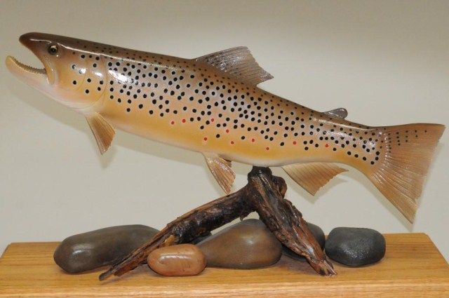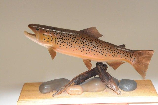Hand carved figural display of brown trout beautifully painted and nicely detailed signed “John Zeiselmeier” numbered 512 dated 1995. This well known artist numbers his work indicating this is the 512th carving.The carving measures approx 11” in height by 20” across its base and is in excellent condition. Est.;$400-$800.