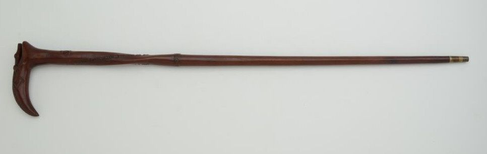 Hand carved from one piece of wood – American folk art cane from the State Capitol building of Pennsylvania erected in 1819 and burned in a fire in 1857 or 1897 which is memorialized in neat raised carved blockletters along with Penn State seal, signed in the same letters Jno L. Shoemaker and gator on grip. A fine and historic cane. Est.: $250-$500.