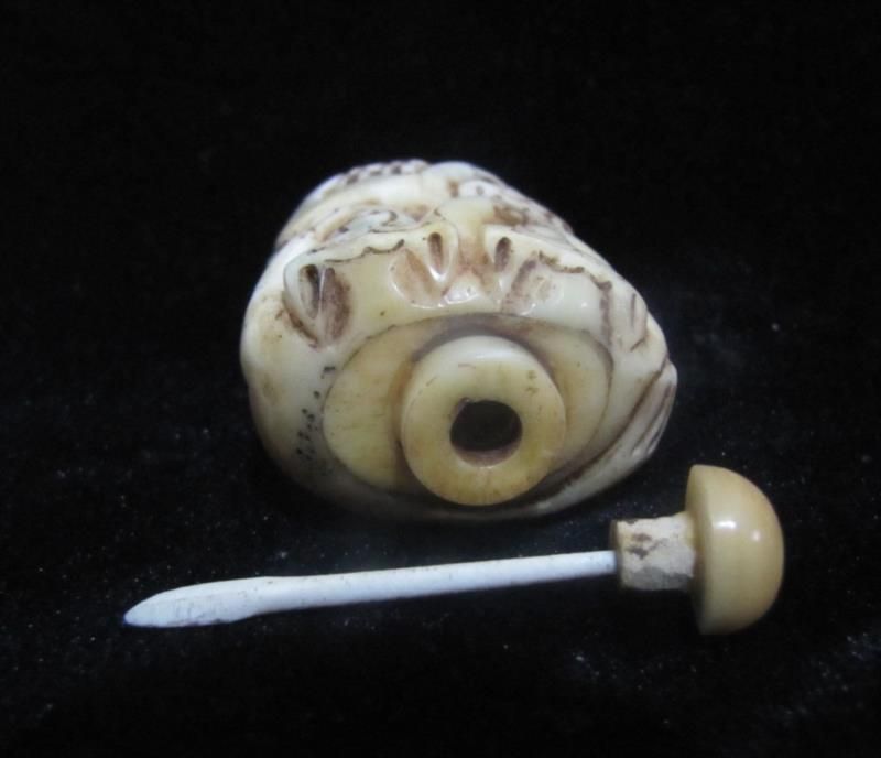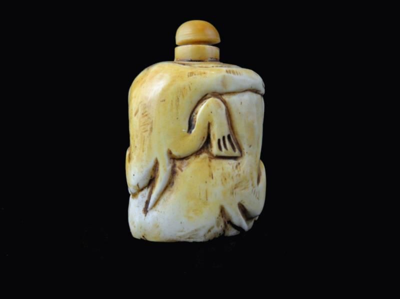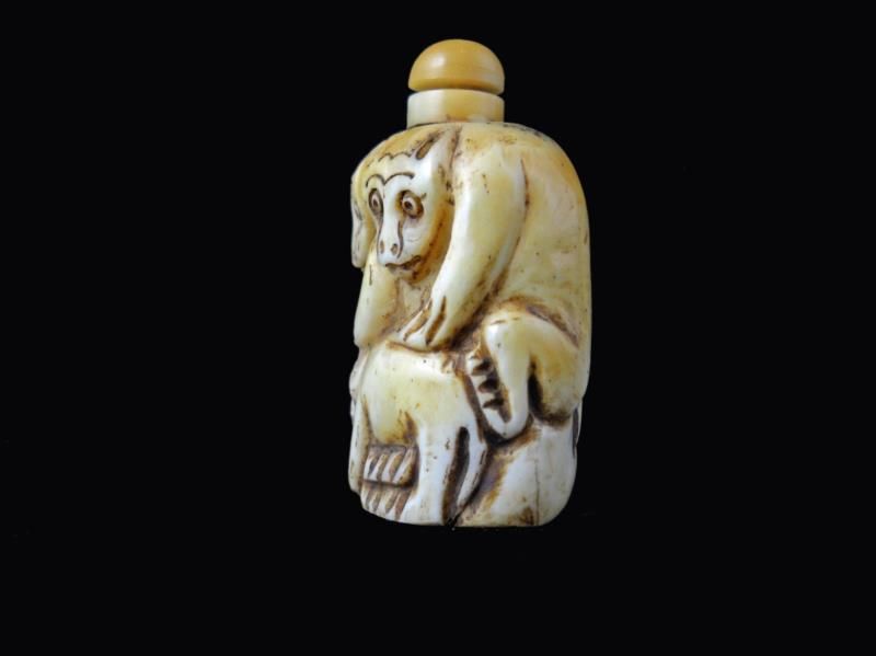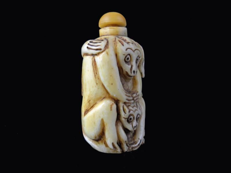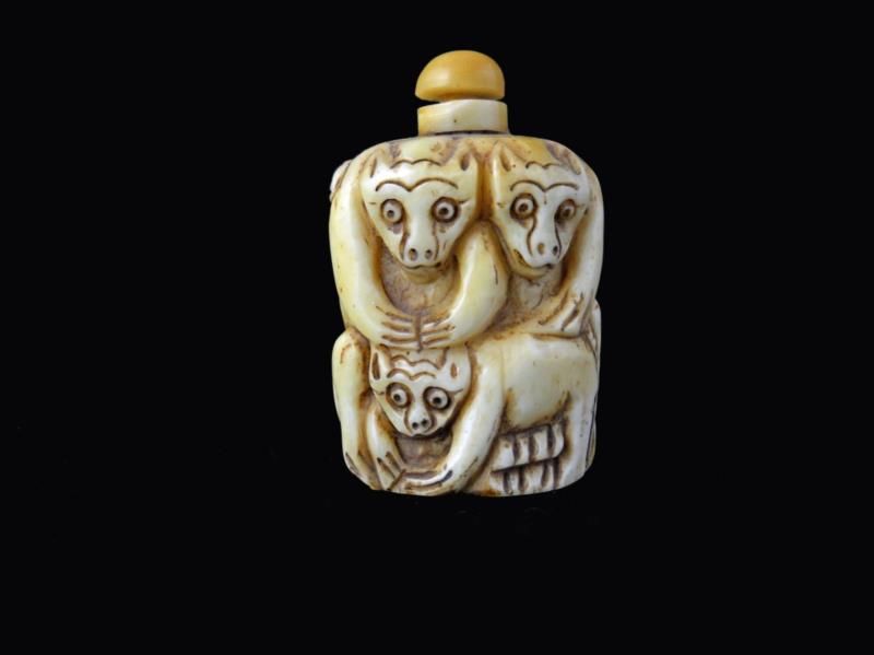 Hand carved oxbone Chinese Snuff Bottle depicting three monkeys measures approx 3 inches tall