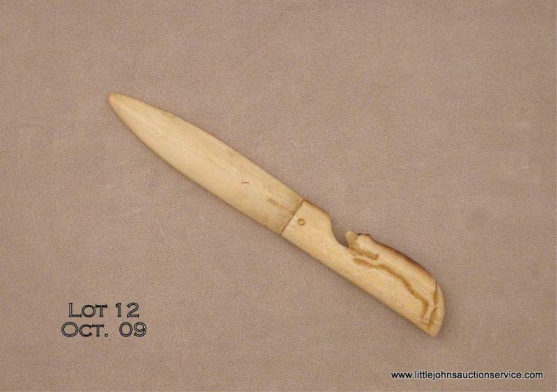 Hand carved whale ivory letter opener, approx. 7-1/2” overall with carved handle in the form of a sled dog. This piece is in overall good condition and shows some age. Est.: $100-$150.