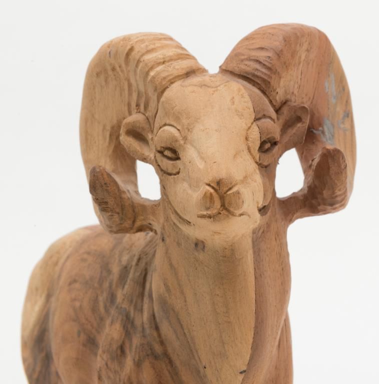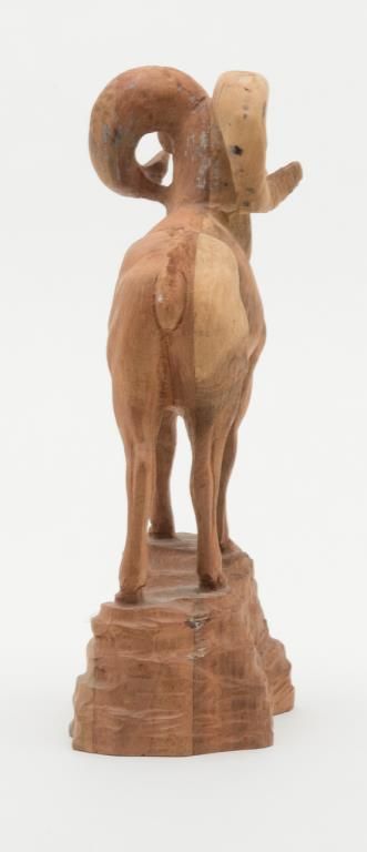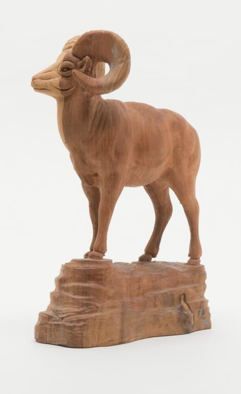 Hand carved wood image of a horned mountain ram approx. 11” tall, 8” long and 4” wide, nicely accomplished; a great decorator for the den or office of the wildlife enthusiast or hunter. Est.: $50-$75.