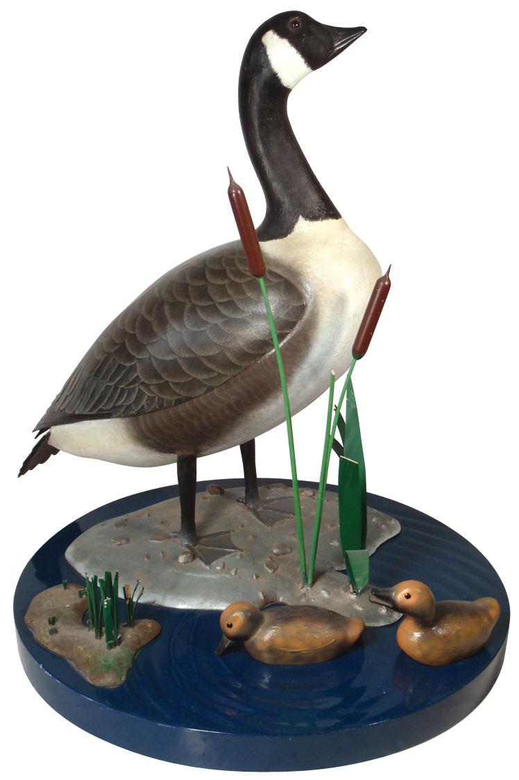 Hand carved wooden wildlife display, goose w/goslings in pond, hand crafted by Darrell Williams-Dayton, IA, some damage to foliage, o/wise in Exc cond, 26"H x 22"Dia.
