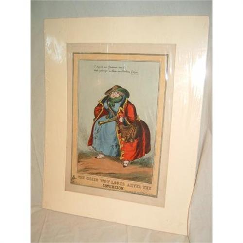 Hand colored engraving by McLean. "The Guard Wot Looks After the Sovereign." The print with the matte measures approx. 15.75 inches by 20 inches. There is a plastic protecant over the print. The top of the print reads, "I says to our overnoe says I-keep your eye on them ere Leaders George. Published April 28, 1829 by McLean.