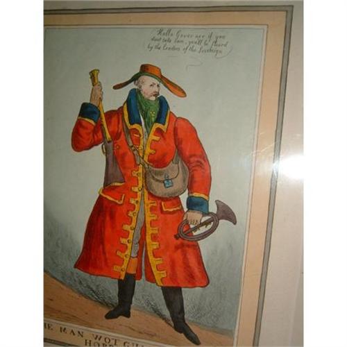 A hand colored engraving by J. Field, "The Man Wot Guards the Hopposition." The Duke of Cumberland, dressed as a guard with broad-brimmed hat, gold laced greatcoat, pouch or satchel, with breeches and top-boots, holds a cocked blunderbuss by the barrel in his right hand, a coach-horn in his left. He says, "Hullo Governer if you don't take care, you'll be floord by the leaders of the Sovereign."