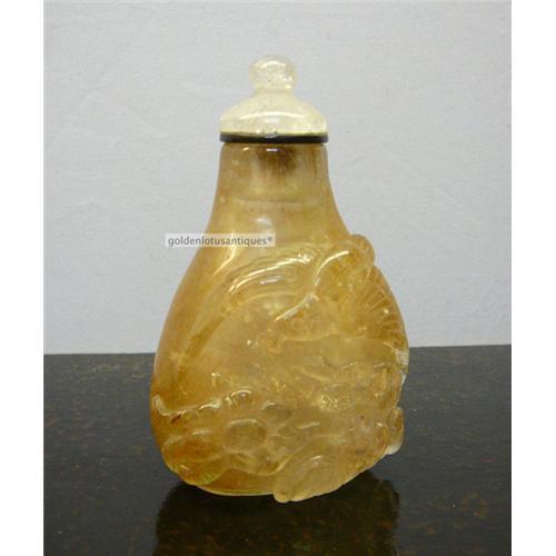 This is a high quality hand-crafted natural crystal snuff bottle. There is a great amount of natural material hairs mixed in the crystal. The inside of the bottle is dug empty and the surface is carved with flowers. It is not an easy task to do the carving on crystal. This piece has the effort of the craftsman and the natural beauty of the nature. It is a nice gift for collectors or friends with meaningful blessing.