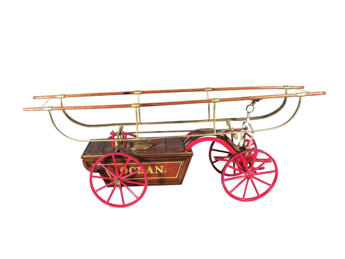 Hand crafted Model of a Button Hand Fire Pumper, ca. 1930's. All parts function but does not pump water. Excellent condition. 25 inches long.