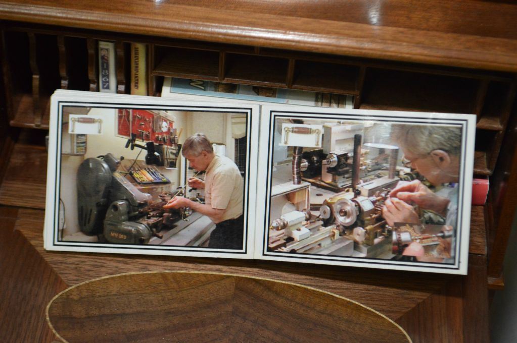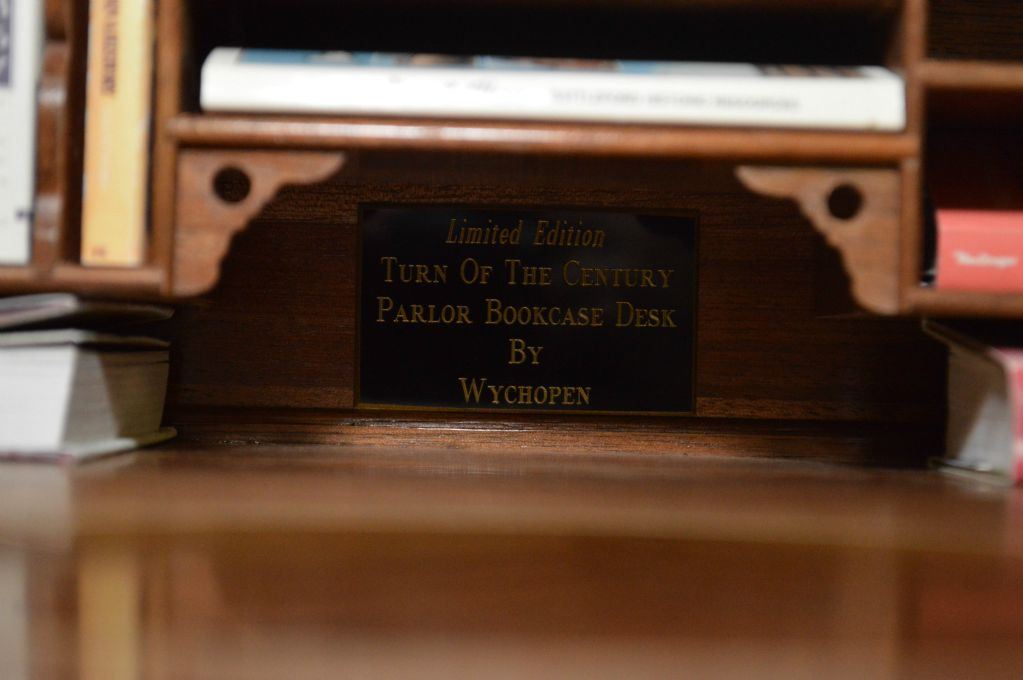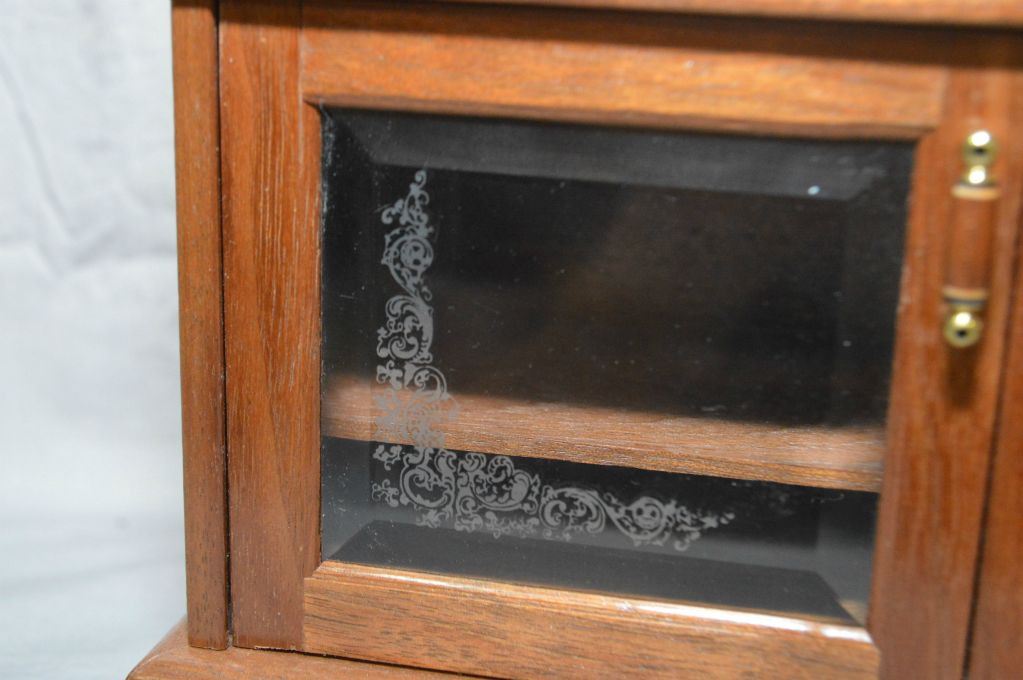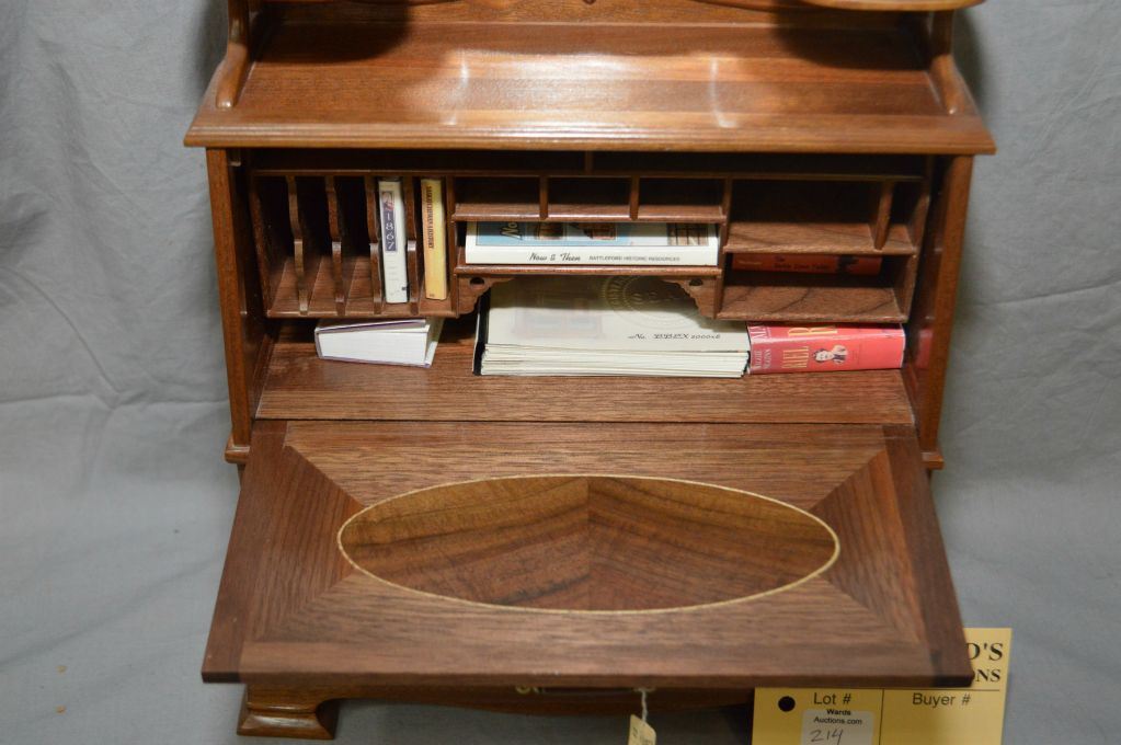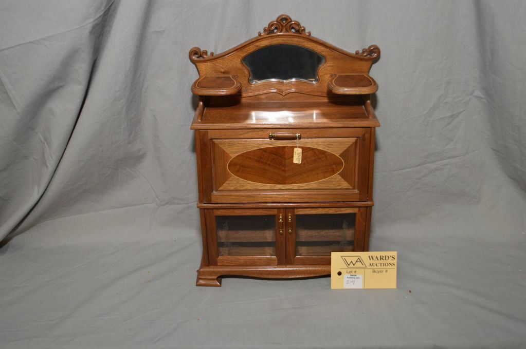 Hand crafted by master craftsman Stan Wychopen miniature drop front secretaire with beveled mirror, fitted interior, inlaid panels, beveled and etched glass doors, hand made books plus a pictoral album of the manufacturing of the piece. 13 1/2" in height
