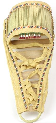 with bentwood frame, bonnet wood slats and beaded yellow cloth, condition is excellent, 16" long. Est. 100-200