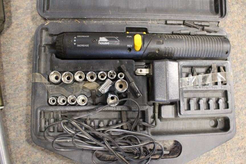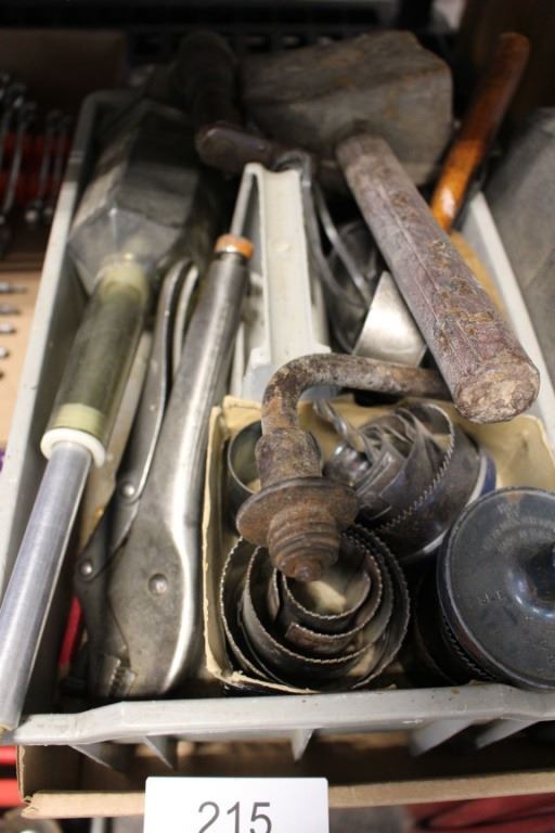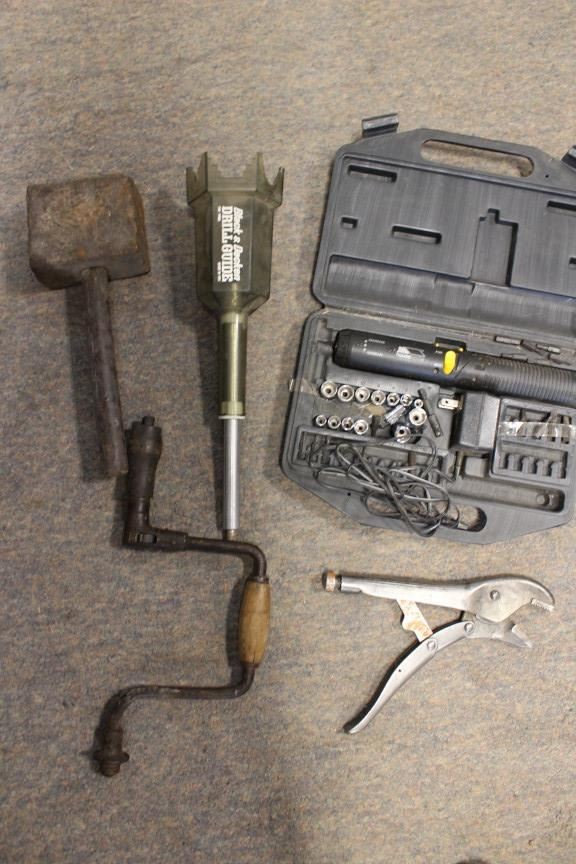 Hand drill, vice grips, tool set, etc