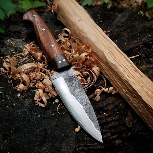 This little bush knife is forged from 1095 with a 4.25" long, 1/8" thick blade. The handle is Zebra wood with an OD micarta bolster and stainless steel pins. This is a really solid and comfortable knife perfect for serious field work. Donated by TimberWest Magazine