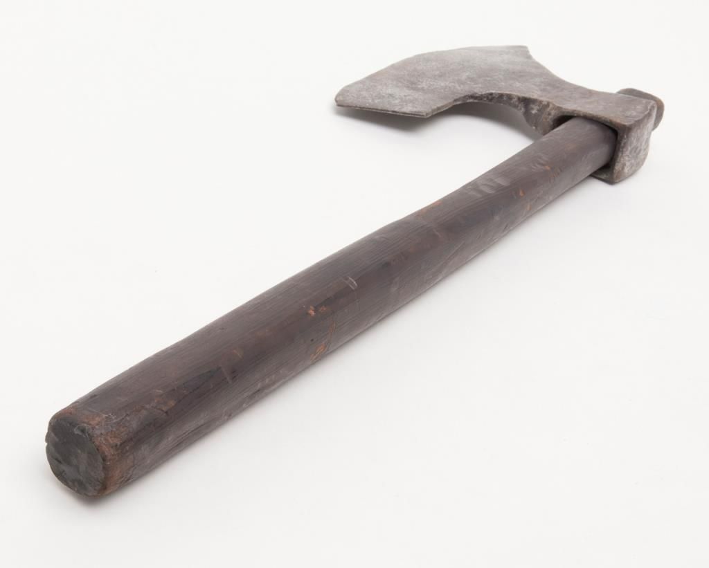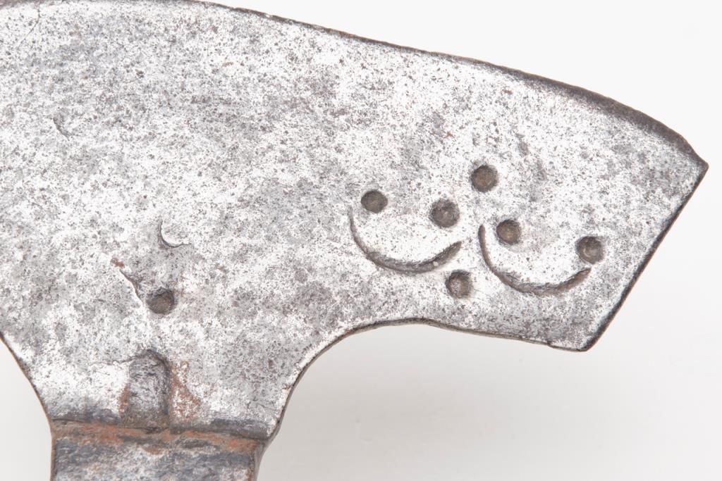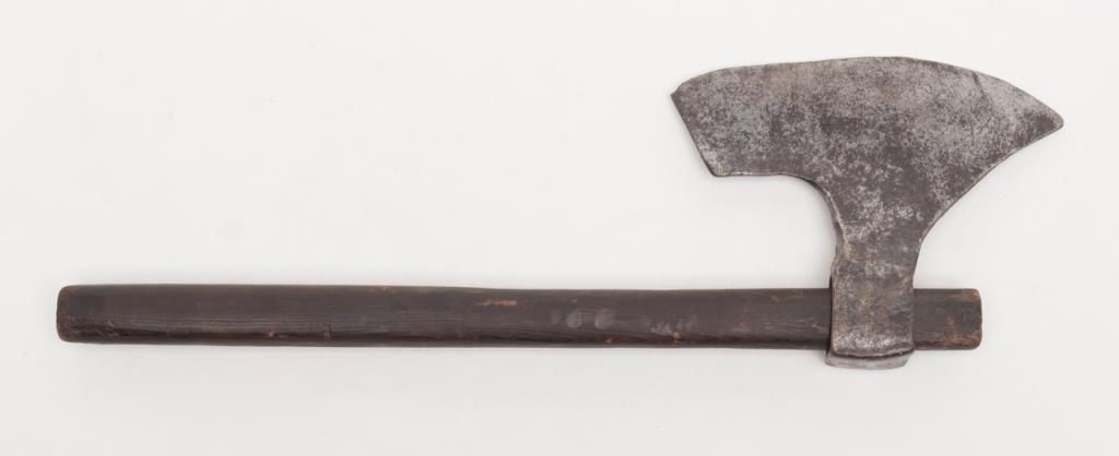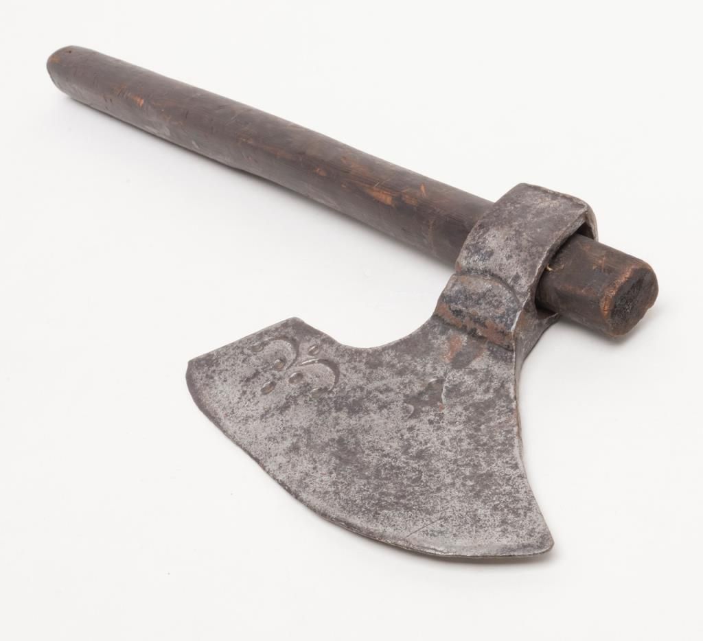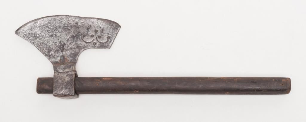 Hand forged axe with touch marks on right side of blade, approx. 9” x 7”; later wood shaft. Est.: $200-$400.