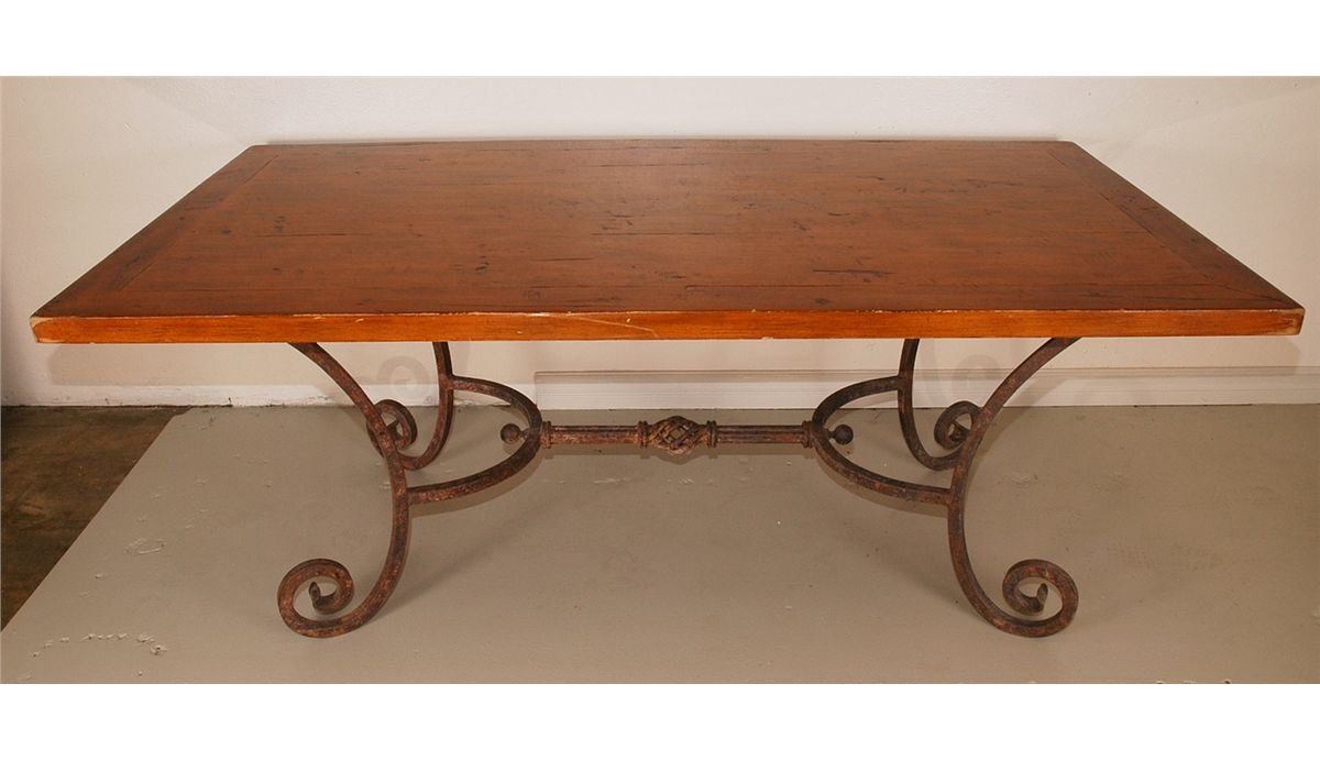 This is a massive dining table with a 78"x42"x29.5"H wooden top resting on a heavy hand-forged iron base. The top is about 2" thick and made of solid wood, antique distressed