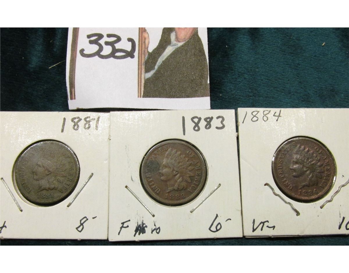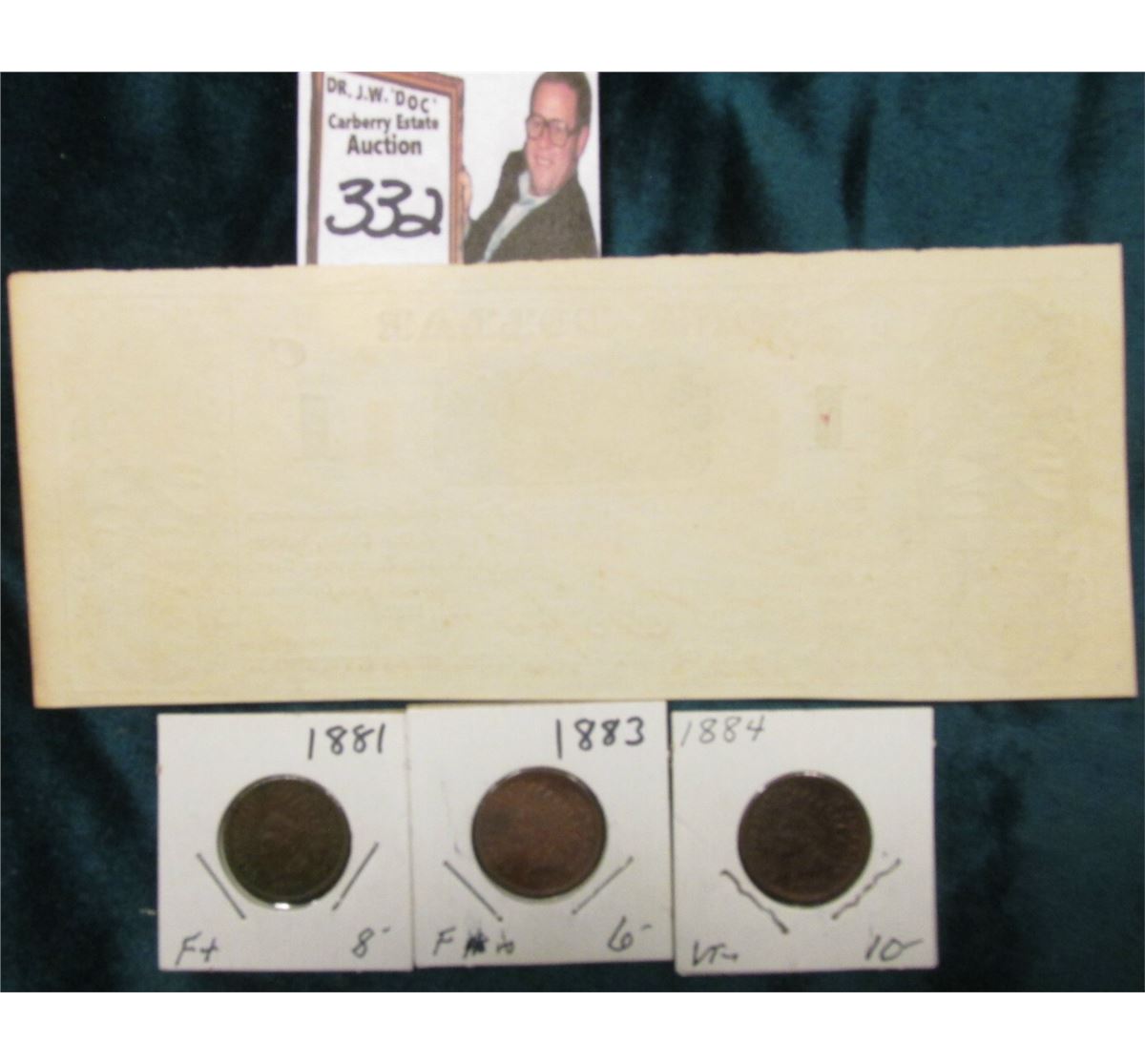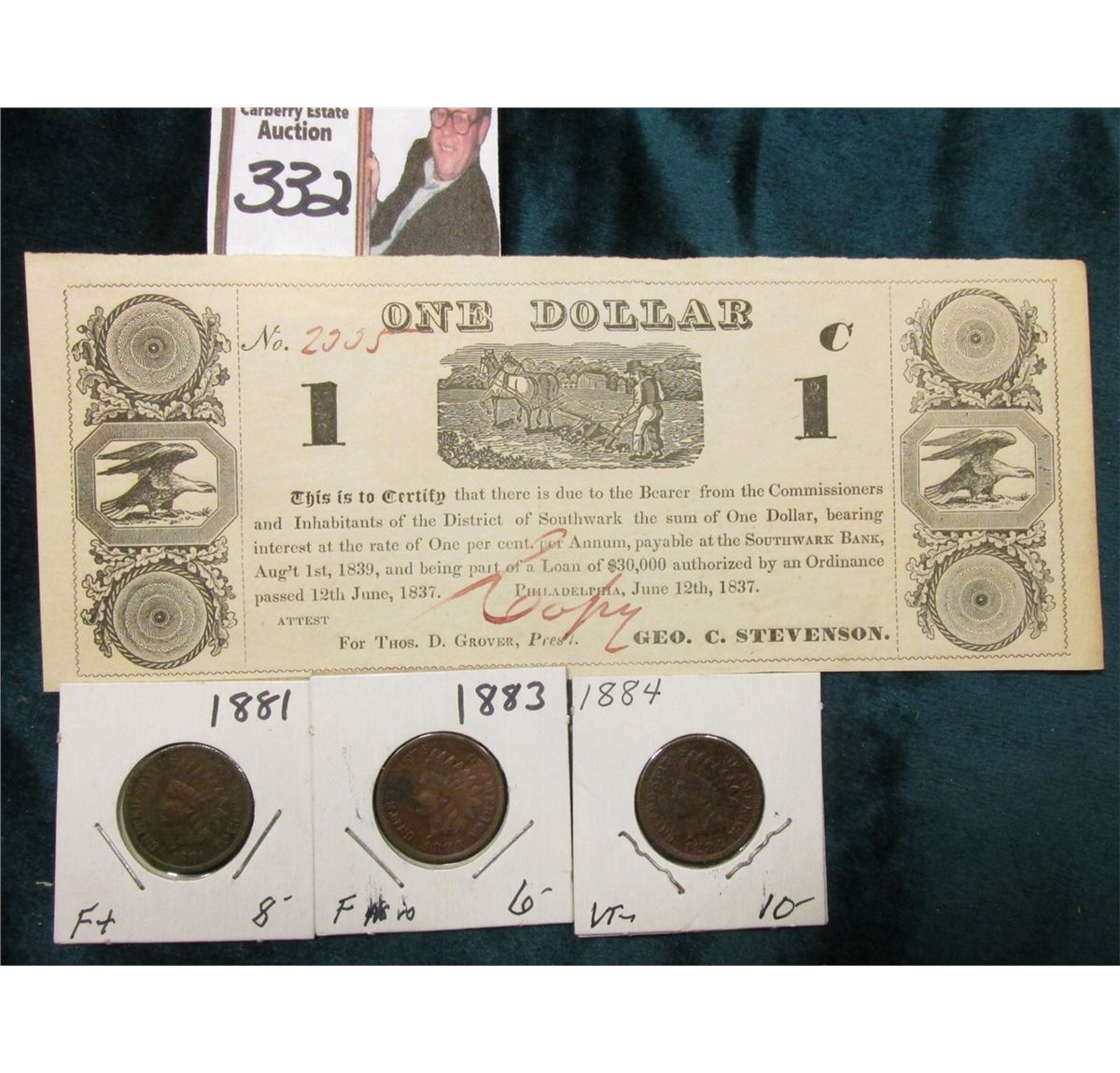 Hand inked in Red-brown Ink (No.)"2005" and "Copy" June 1837 One Dollar "Inhabitants of the District of Southwark" Pennsylvania. 'Doc' thought it might be a Proof as the inking is quite old; & 1881, 1883, & 1884 Indian Head Cents.
