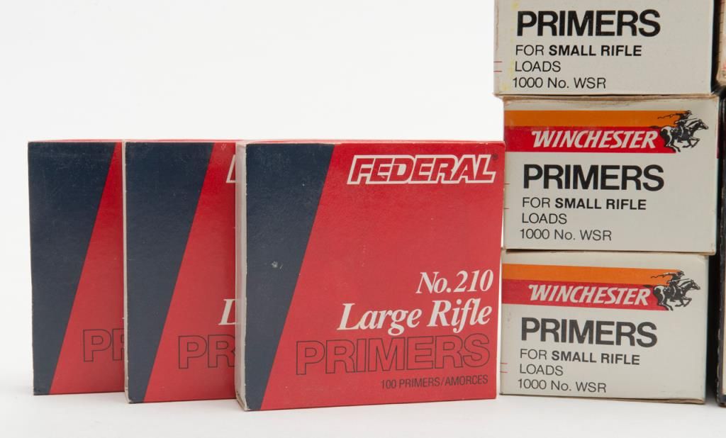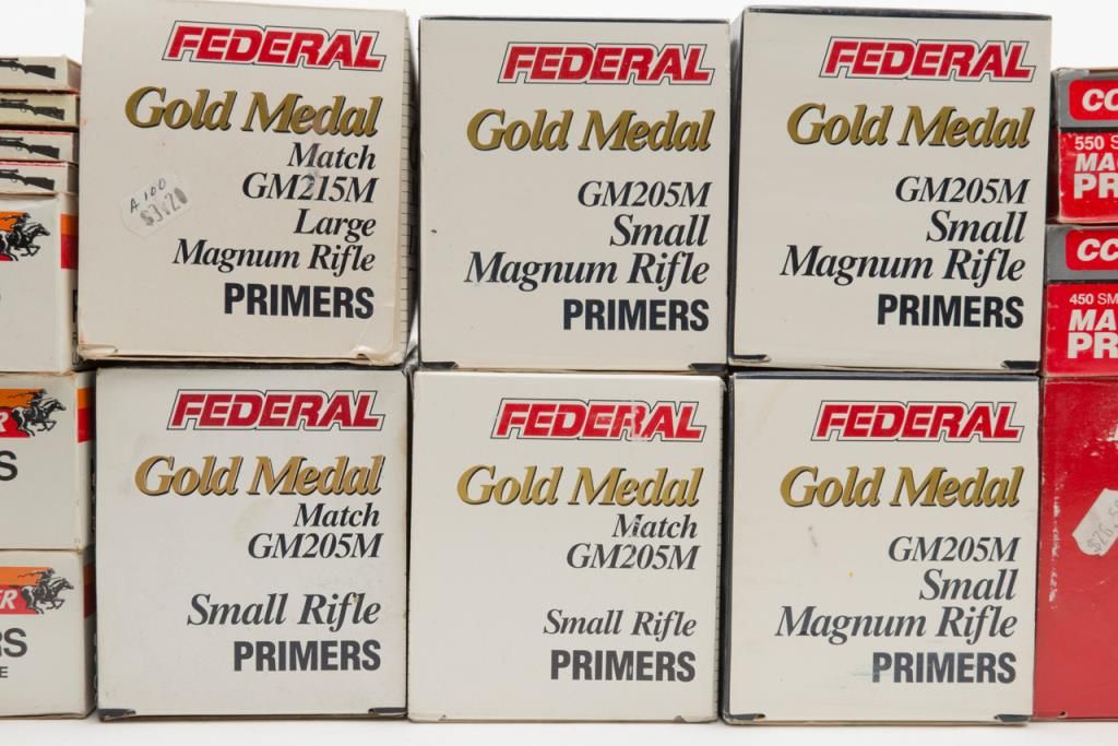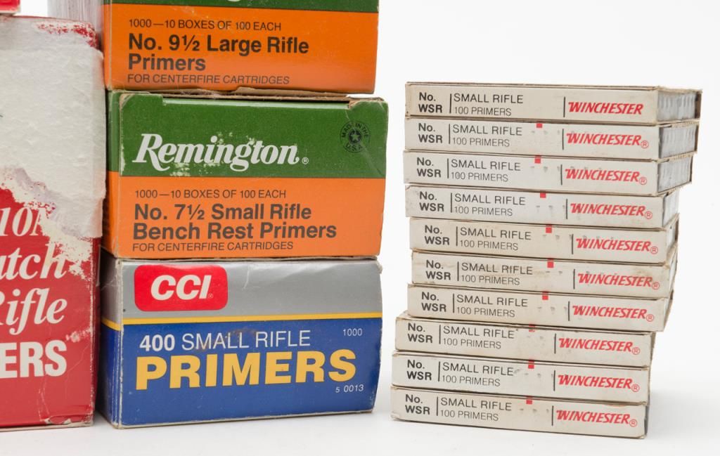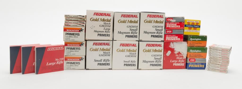 Hand loaders lot of primers for rifle cartridges. The lot includes approximately 15,000 primers by various manufacturers including Federal, CCI, Remington and Winchester. The primers include; Large Rifle, Small Rifle, Large Magnum and SmallMagnum in both standard and match varieties. A great lot for the hand loader. Est.: $200-$400.