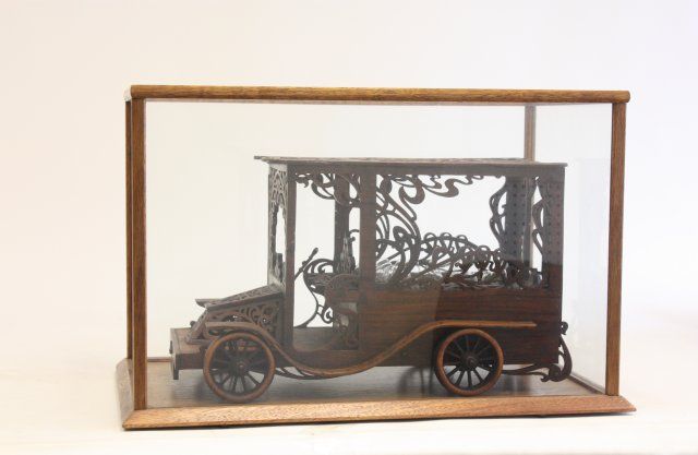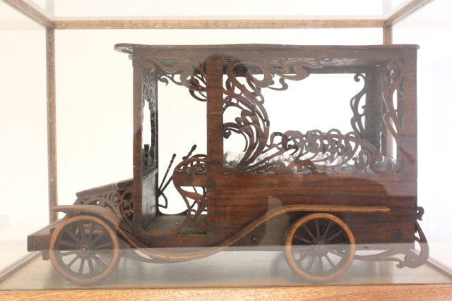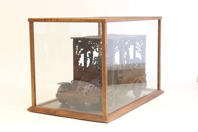 In the shape of an "Old Car". With complement of crystal glasses. Bottles missing, in case. Approx. 12" H x 19" L, 24.5" W x 15.5" H x 15.5" D total with case. Please read our terms of sale.