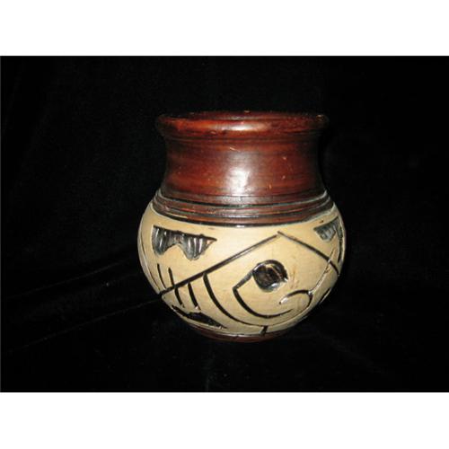 Art Pottery Vase Made in Barzil. Hand wheeled and scribed with interesting and unusual designs. The rich brown color highlights the lighter tan clay with unique symbols carved into the body. Excellent craftsmanship! Displays the made in Brazil paper sticker on the bottom. MINT Condition!
