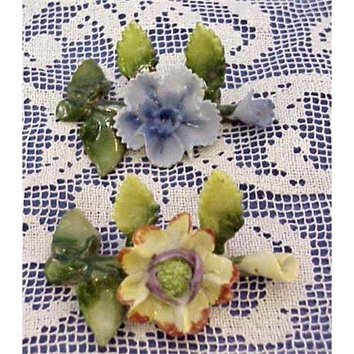 These are very pretty hand modelled and painted, fine bone china Floral name tags - Made from fine bone china - Germany - Lovely flowers - These are made to display tiny card-name tags before fancy dinner - Very good condition - Measures about 2 1/4" long and about 1" high - Buyer to pay 6.00 for ship. + insce - Thanks!