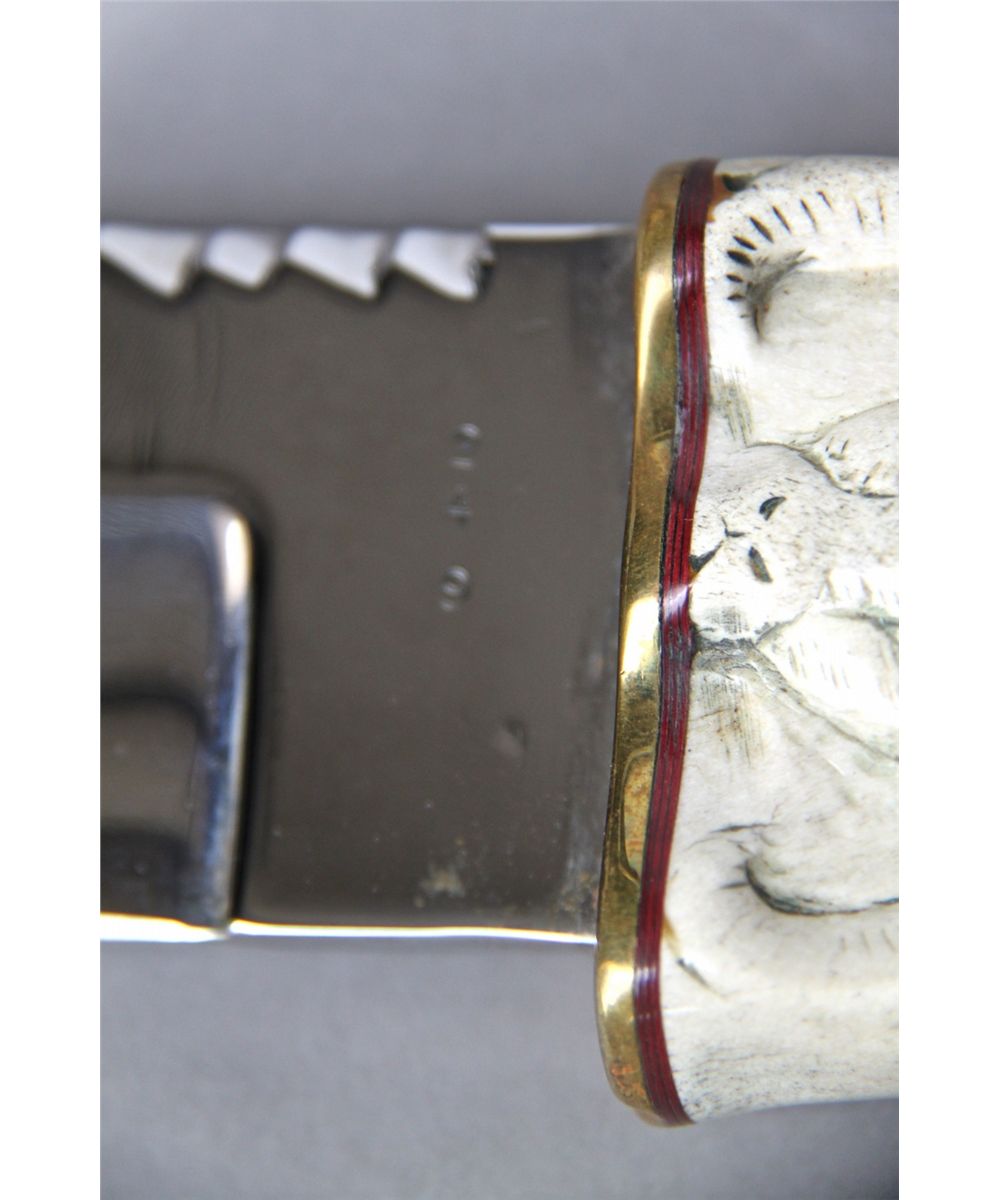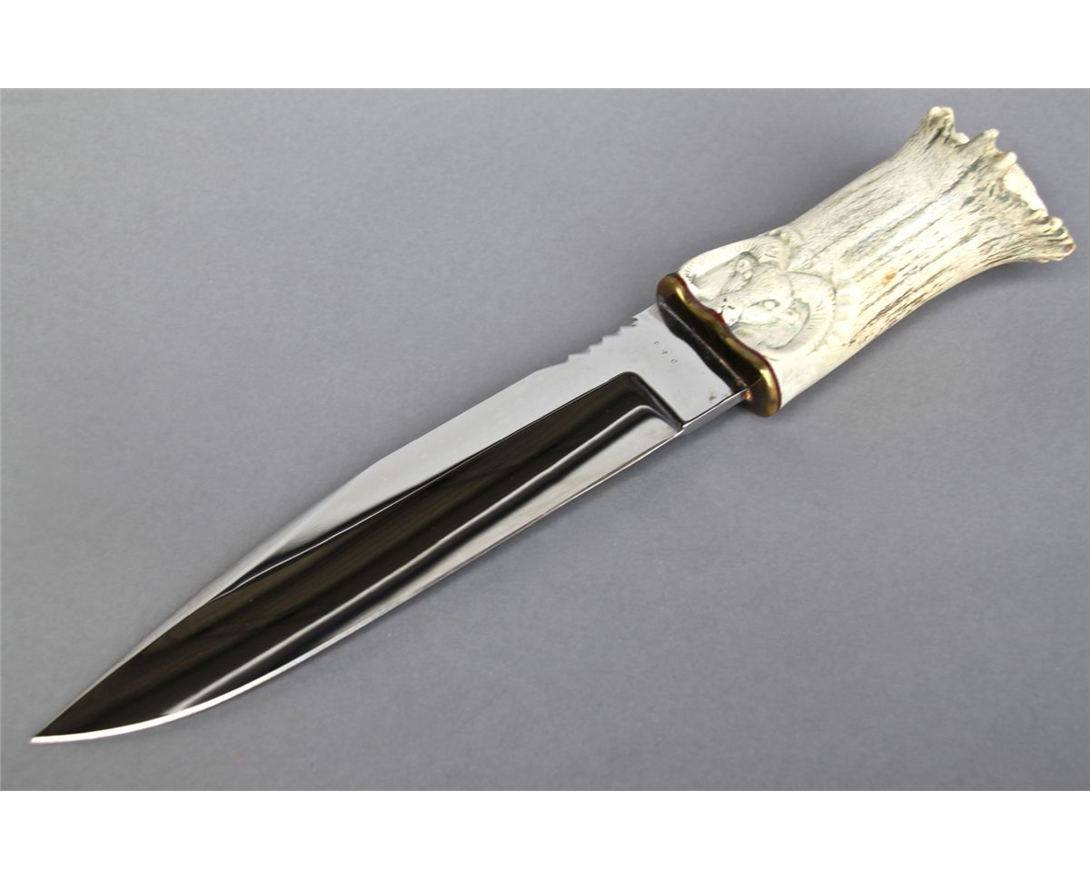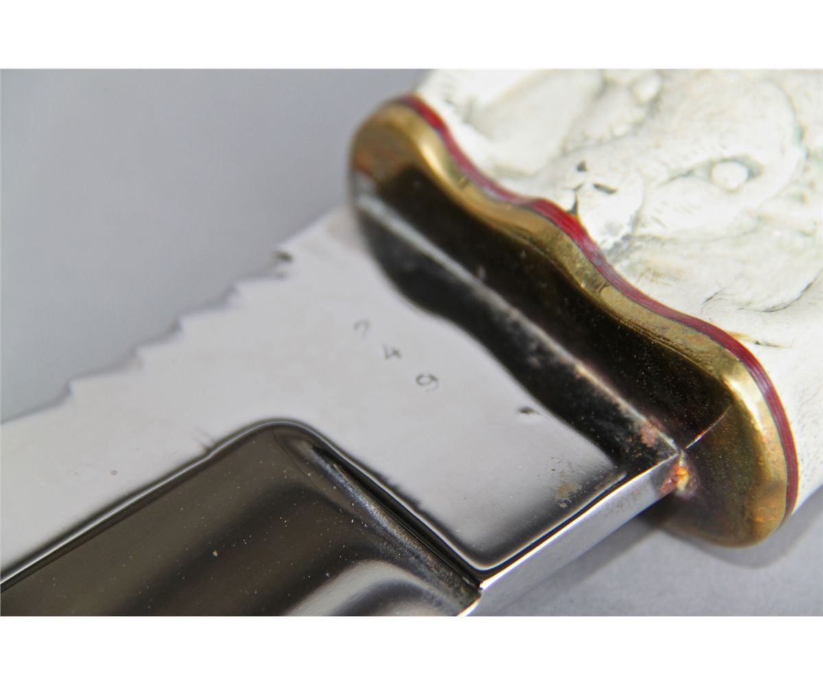 Hand made Knife w/ Hand Carved Antler, Rams Head Handle [Height/Length (in)= 15.25, Width (in)=3, Depth (in)=2.75, Weight (lbs)=2] With C.O.A. signed by Chief Joe Dan Osceola & Seminole Tribe. Go to: www.pangaea-auctions.com for more information about this collection.