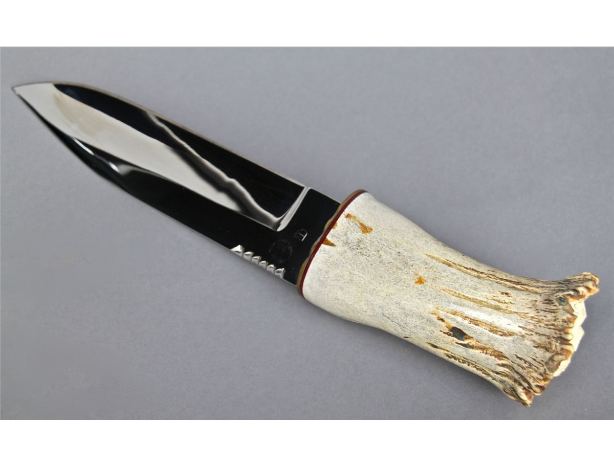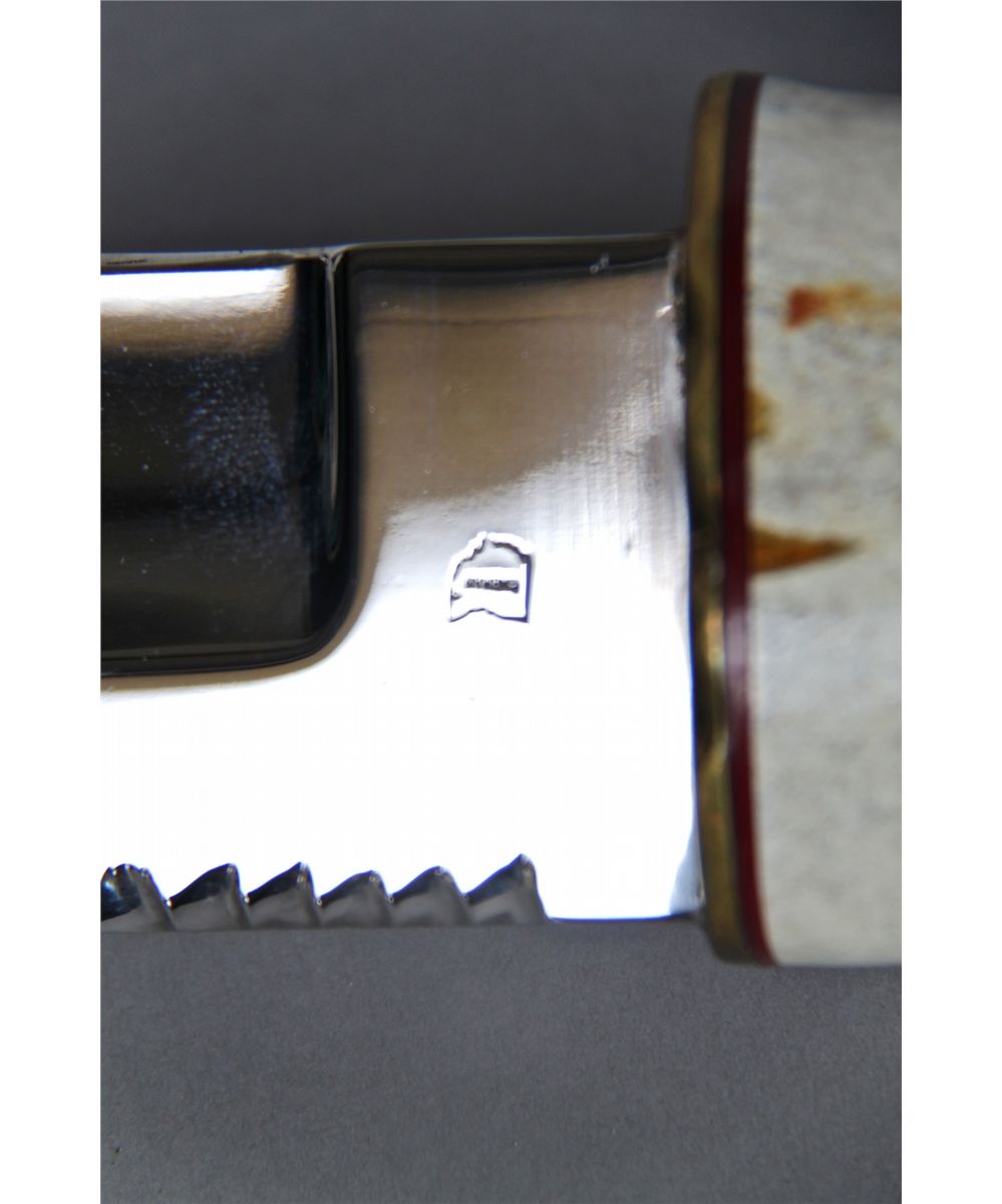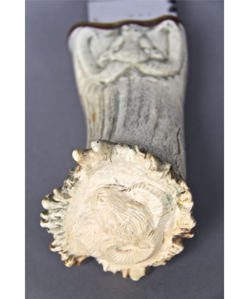 Hand made Knife w/ Hand Carved Antler, Rams Head Handle [Height/Length (in)= 15.25, Width (in)=3, Depth (in)=2.75, Weight (lbs)=2] With C.O.A. signed by Chief Joe Dan Osceola & Seminole Tribe. Go to: www.pangaea-auctions.com for more information about this collection.