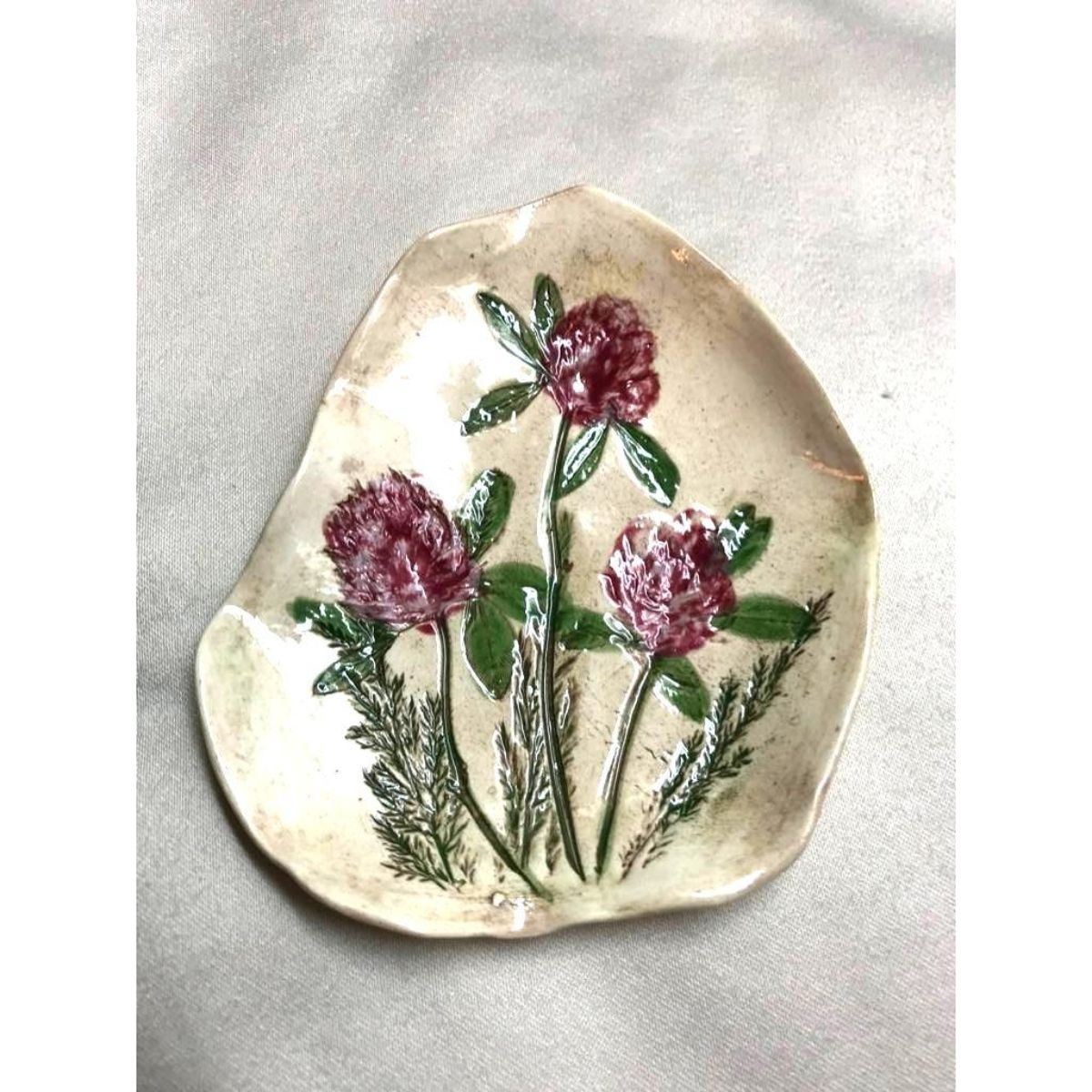 Vintage hand-made "Pink Clover" ceramic friendshippin dish, tray, signed by the artist, Pearl Danley, on the reverse side. Created by the artist using the imprint of real flowers.
