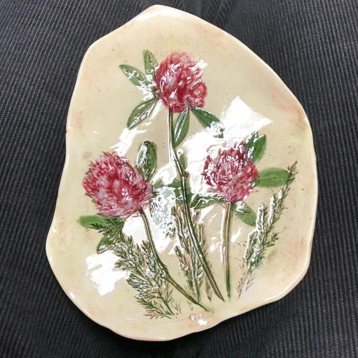 Vintage hand-made "Pink Clover" ceramic friendship pin dish, tray, signed by the artist, Pearl Danley, on the reverse side. Created by the artist using the imprint of real flowers. 4" W X 5" L. In the secret language of flowers red clover represents "think of me". Â