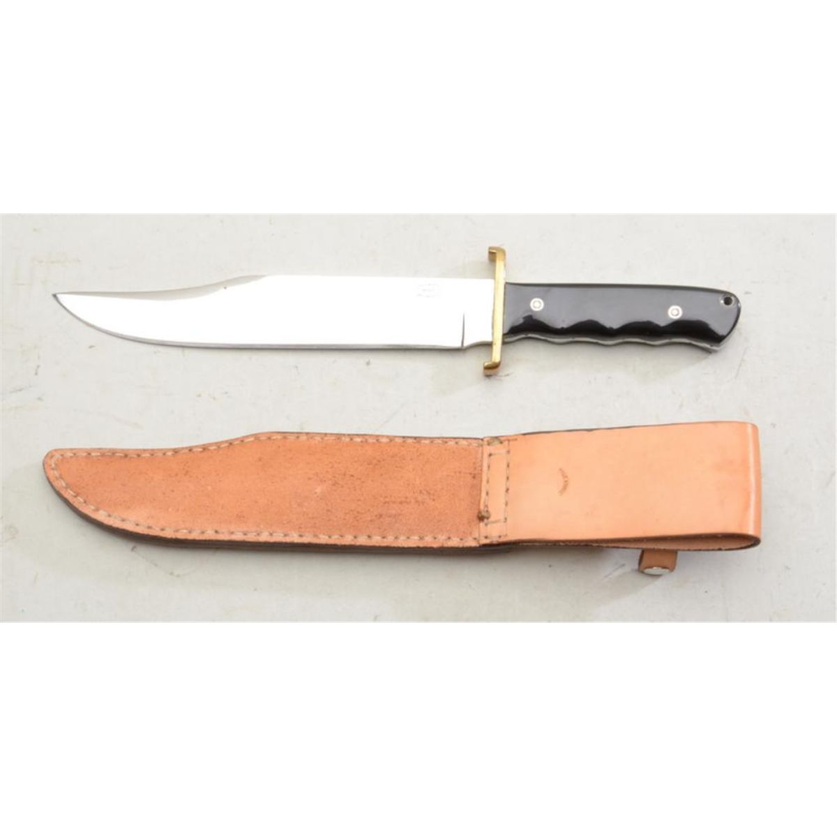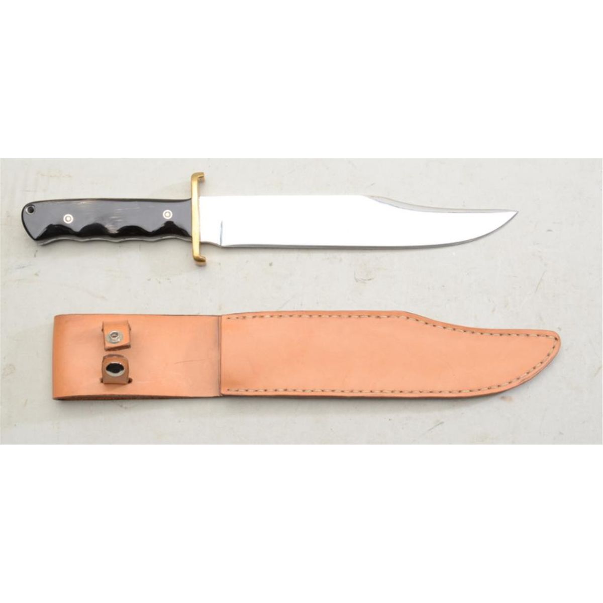 Hand-made custom clip-point bowie knife marked “Dale White, Maker, Sweetwater, TX”. 13-7/8” overall, 9-1/8” blade. Brass guard, polished horn grips, Dale White trademark bolsters with fine quality manufacturethroughout. Original polish and grind. Fine condition, some spotting from scabbard which is also marked by maker. Blade would polish to excellent. Est: $300 - $600
