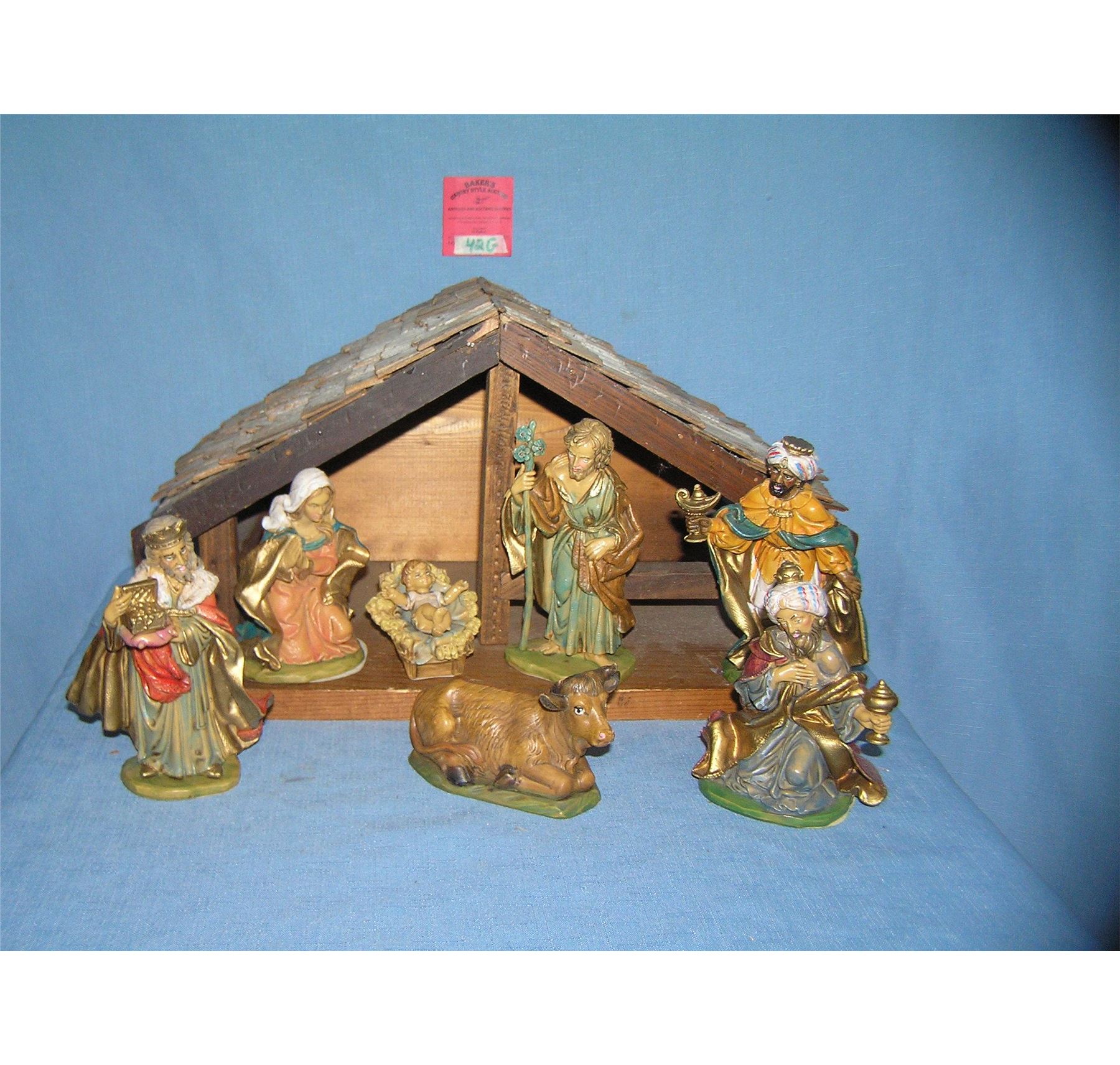 Hand made wooden illuminated manger with 7 Italian figures est. value $175.00-$200.00