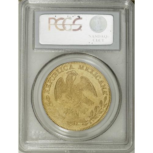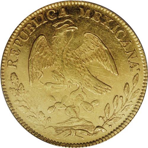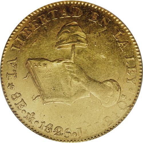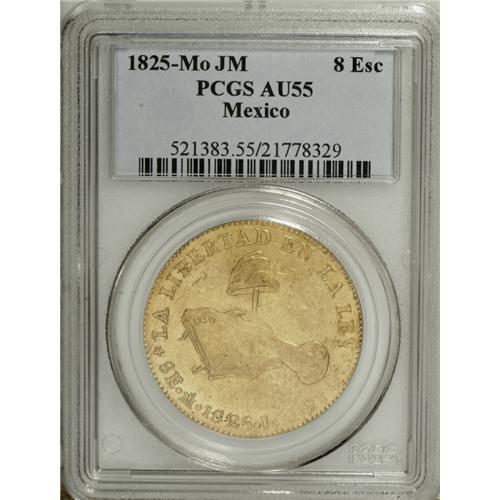 <B>Hand on Book gold 8 Escudos 1825-Mo JM,</B></I> KM-383.9, Small Book, lustrous AU55 PCGS, lots of small abrasions and a "dirty look" (so favored by most collectors as a sign of originality), soft areas of strike--but this is quite a pleasing example of an early Mexico City Mint issue.<BR><BR><b>Shipping:</b> Coin/Currency (<a target="_blank" href="http://www.heritageauctions.com/common/shipping.php">view shipping information</a>)