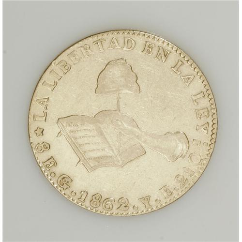 <B>Hand on Book gold 8 Escudos 1862-Go YE,</B></I> KM-383.7, lustrous XF, usual areas of weak strike, lots of small abrasions.<BR><BR><b>Shipping:</b> Coin/Currency (<a target="_blank" href="http://www.heritageauctions.com/common/shipping.php">view shipping information</a>)