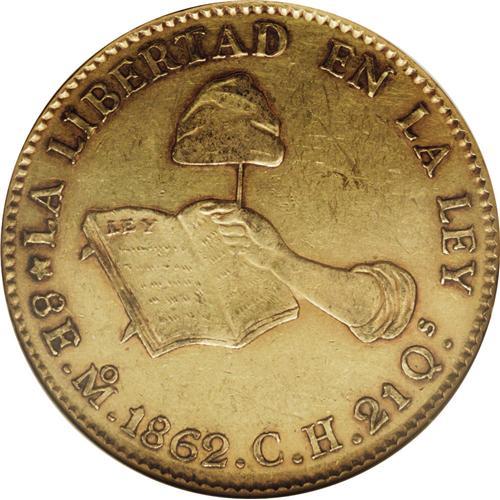 Hand on Book gold 8 Escudos 1862-Mo CH, KM-383.9, AU50