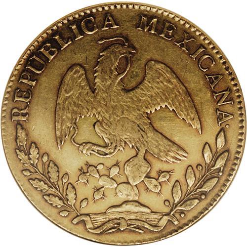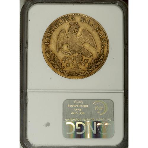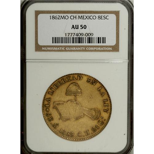 <B>Hand on Book gold 8 Escudos 1862-Mo CH,</B></I> KM-383.9, AU50 NGC, "old gold" look.<BR><BR><b>Shipping:</b> Coin/Currency (<a target="_blank" href="http://www.heritageauctions.com/common/shipping.php">view shipping information</a>)