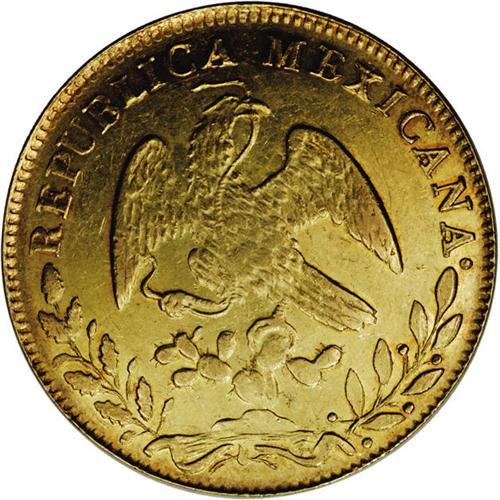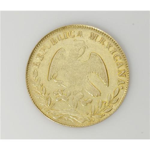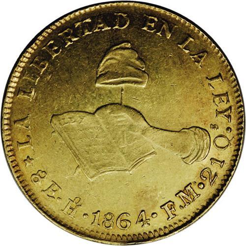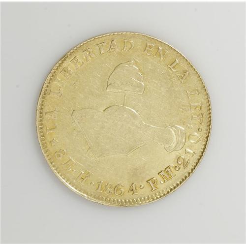 <B>Hand on Book gold 8 Escudos 1864-Ho FM/PR,</B></I> KM-383.8, Choice XF-AU, normal strike, just tiny abrasions, attractive yellow-gold toning--a pleasing example of this rare variety.<BR><BR><b>Shipping:</b> Coin/Currency (<a target="_blank" href="http://www.heritageauctions.com/common/shipping.php">view shipping information</a>)