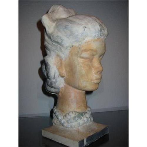when i stepped into Leonard Scheu studio at his private estate in laguna beach, california, this sculpture, (bust of a women's head and neck) spoke to me. he was a listed artist who passed 20 years ago. this was on his book case next to his work table. i immediately felt that i have to have it. this sculpture is primitive, considers a folk art, created by well known artist and is very interesting. it is over 12 inch T. made of a plaster and hand painted. it is in excellent condition but paints and touches have imperfection. her hair color is grey and white and her face is neutral. wearing a gorgious necklace same color as her hair . faboulous design on accent table "display alone". this is a fascinating subject. i am told that she was somehow involve with the artist.