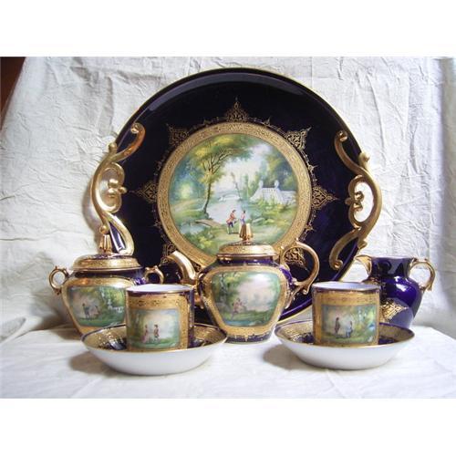 Porcelain tea set with 8 different hand-painted images of people being romantic in nature.