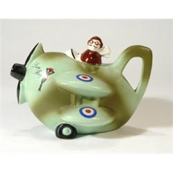 Hand painted Carltonware Lucy May military aeroplane teapot, marks to base, 18cm high