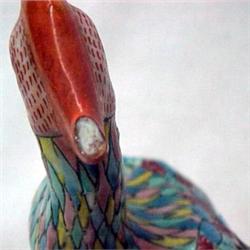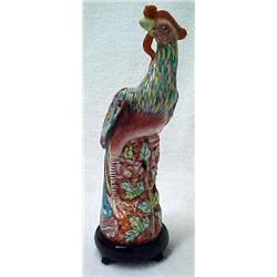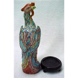 Hand painted Chinese porcelain peacock with wooden stand, Tongzhi period 1862-1874, chip (piece is included) with Neiman Marcus Galleries tag, 8 3/4" high on stand