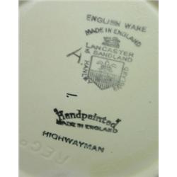 Hand painted English toby mug. Measures 5" tall. Marked on bottom "English Ware-Made in England-Lancaster & Sandland-Hanley England-Hand painted-Made in England-Highwayman."