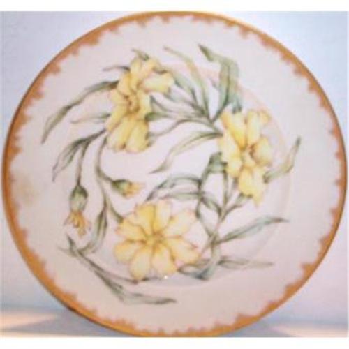 This lovely Hand Painted Plate is decorated with delicate yellow blossoms on green stems and is then gilt with a brushed gold around the outside periphery of the plate. The plate is in excellent condition with no chips, cracks, dings or hairlines and measures 9.50" in diameter. It is unmarked on the back but I believe this is Bavarian porcelain.