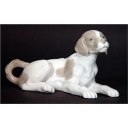Hand painted Nao seated dog, marks to base, 16cm in length